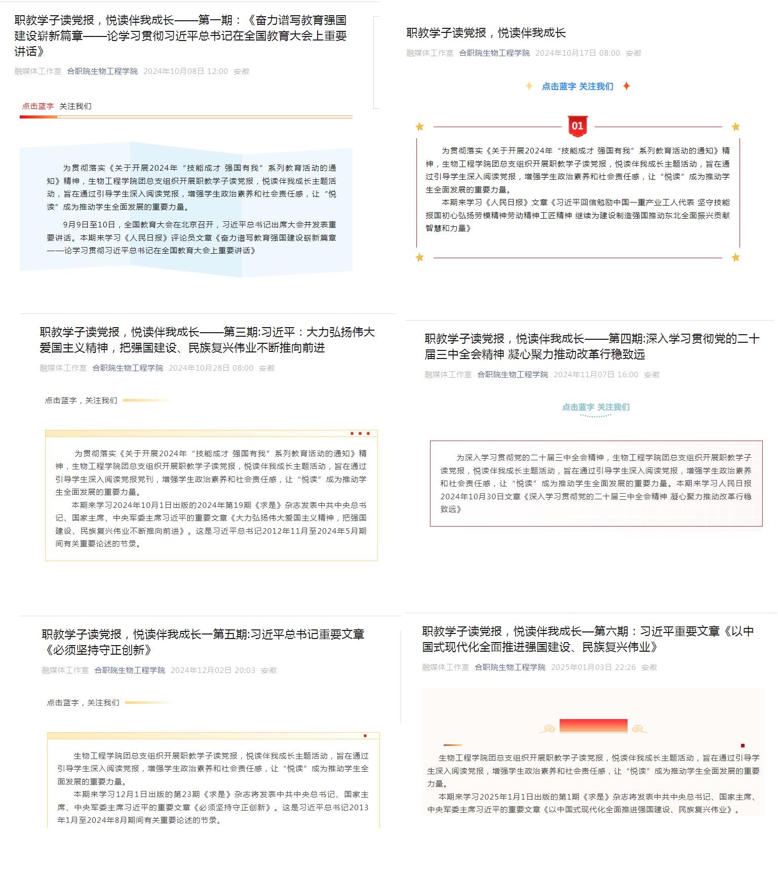 活动开展至今,吸引了众多学生的积极参与。学院组织学子共读《人民日报》、《求是》精选的篇目原文,让学生们共同了解国家大政方针,感受时代的脉搏,促进思想政治理论的深化与实践。这些文章涵盖了国家发展的重大战略、社会热点问题的深度剖析以及先进典型的感人事迹等,内容丰富、意义重大。比如,10月30日出版的人民日报文章《深入学习贯彻党的二十届三中全会精神 凝心聚力推动改革行稳致远》、12月1日出版的第23期《求是》杂志将发表中共中央总书记、国家主席、中央军委主席习近平的重要文章《必须坚持守正创新》等,同学们阅读后纷纷留言反馈自己读党报的感受感想,表示作为新时代的职教学子,在今后的学习中要牢固树立技能成才的信心和技能报国的决心,努力学习技能,做对社会有用的贡献者。