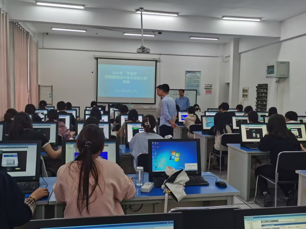 本次比赛设置初赛和决赛两个部分,其中初赛重点考核药物制剂理论知识和压片工艺仿真模块,决赛重点考核学生对固体制剂生产更衣净化和片剂生产前准备、生产过程控制和生产后清场实践操作。本次比赛邀请了华益药业的生产总经理李玉宝和技术骨干张謦作为专家评委,在现场认真评判选手的操作流程,对压片技术的每一个环节进行严格把控,从设备调试、物料称量、压片操作到质量检测,不放过任何细节,以严谨的态度和专业的标准为大赛打分。赛场上,选手们沉着冷静,熟练操作,精心调试压片设备,精准称量物料,专注地控制压片过程中的各项参数。每一个动作都展现出参赛选手扎实的专业功底和对药物制剂压片技术的深刻理解。