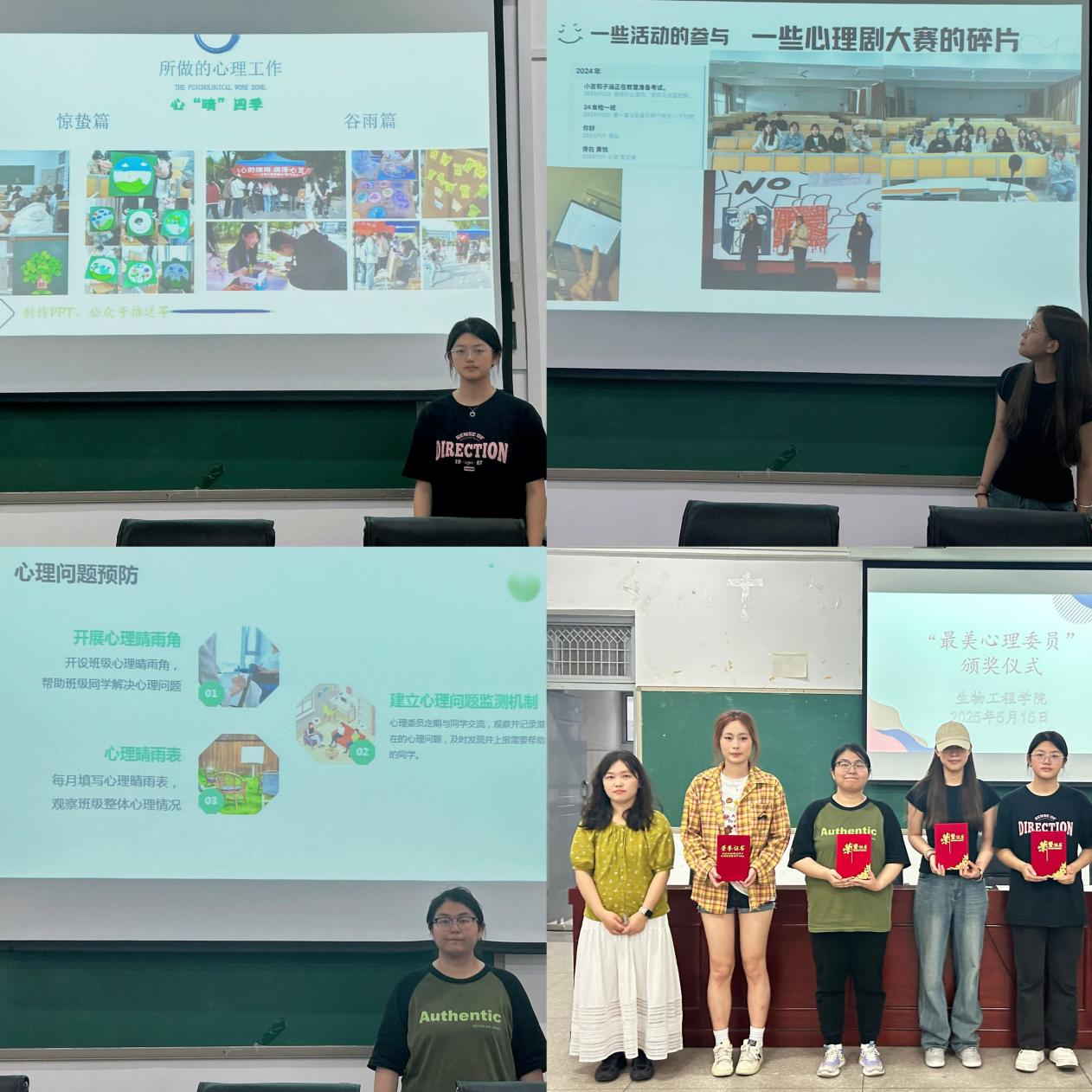 在“最美心理委员”评选环节,经过层层筛选与综合评审,5名心理委员凭借扎实的工作能力和创新实践脱颖而出,获评年度“最美心理委员”。“最美心理委员”们始终秉持着高度的责任感与使命感,以专业的知识储备和温暖的人文关怀,为学院心理防线筑牢了坚实的根基。在日常工作中,他们积极主动地投身于心理知识的宣传普及工作,组织主题讲座、制作心理健康手抄报、心理健康知识微信推文等。同时,他们精心策划并组织了一系列丰富多彩、富有成效的心理活动,如心理观影、心理健康主题班会、心理情景剧表演等,极大地激发了同学们参与心理健康教育的热情,为营造积极健康、和谐向上的校园心理氛围贡献了重要力量。