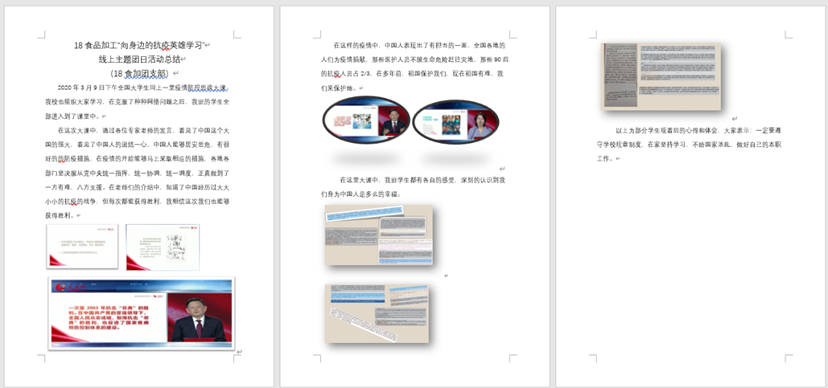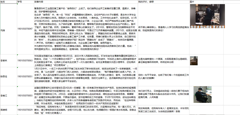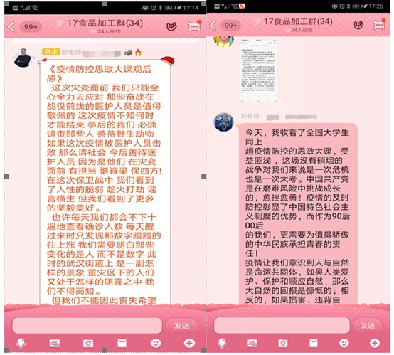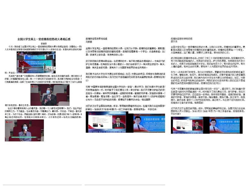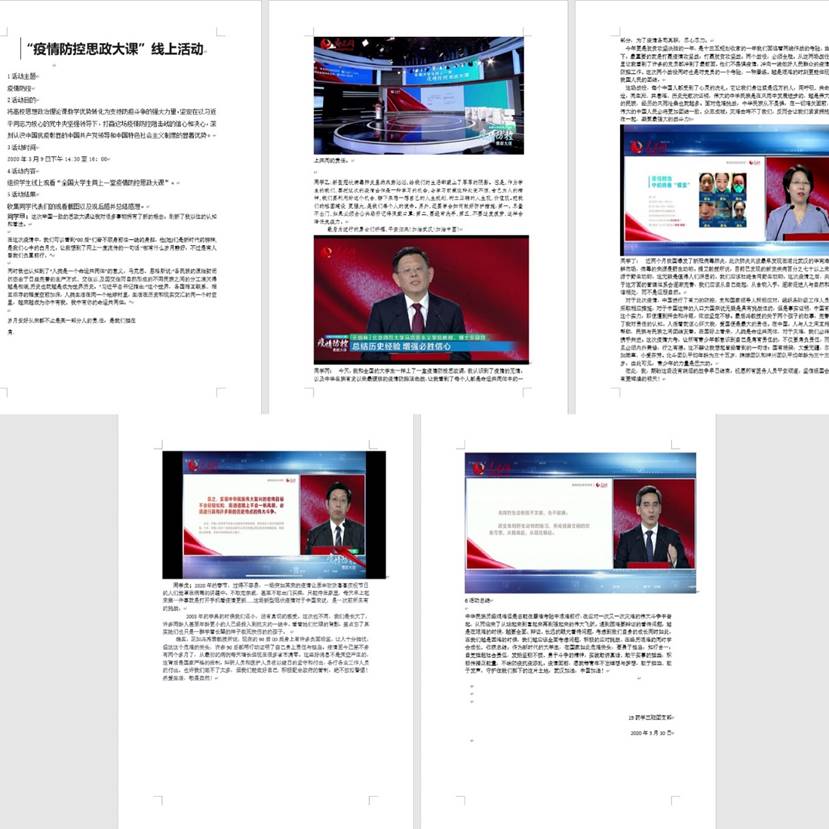活动开启之时,各班团支部对于如何学习“思政大课”采取了不同方式,如:师生在班级群中互动交流对于收看本课的感想;选出学生代表发表观后感言;鼓励学生以寝室为单位互相学习并交流想法;收集全班每一位学生收看大课时的现场照片及其观后感;动员全体学生每人分享一则自己身边亲眼所见亲耳所闻的抗疫小故事等等。