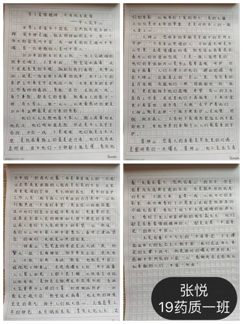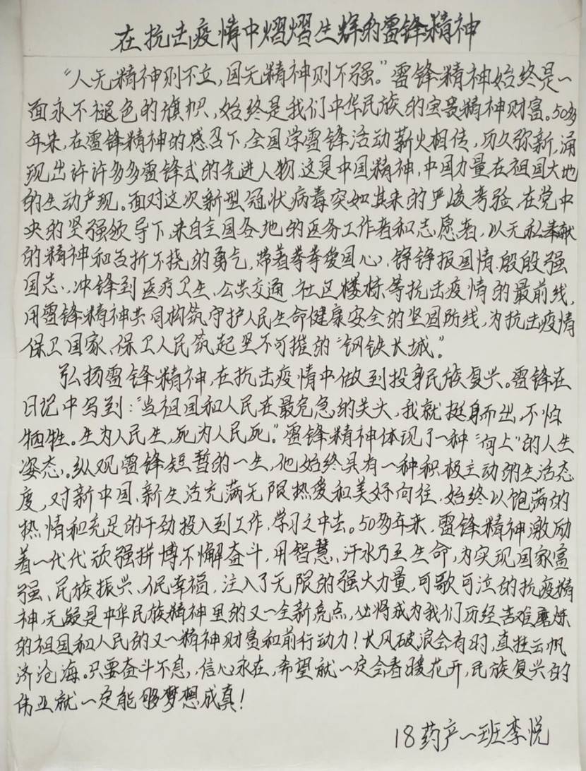 “学习雷锋精神,坚守一线岗位”。疫情暴发,武汉急需救援,你们主动请求去一线岗位去献上一份自己的力量,没有什么演习,这就是一场没有硝烟的战争。在全国各地奔赴武汉,我们都知道这是能够通过呼吸传染的新型病症,没有任何的特效药保障,谁都不知道这一去是否能够回来,但是,你们没有犹豫。你们知道的只是一线需要我们,人民需要我们。这大公无私的奉献精神正是雷锋精神的完美呈现,向你们学习。