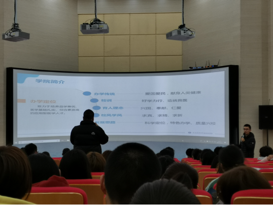 会议开始,安徽医科大学临床医学院王翔飞老师对安徽医科大学临床医学院做了全面的介绍并列举了学历提升的种种优势,强调专升本对于专科学生的重要性。随后,王翔飞老师解读了2021年“专升本”最新政策,并且对招生计划、招生对象、报考时间、考试科目、填报志愿以及专升本的意义等内容进行了认真讲解,对与会同学提出了一些积极合理的建议。最后王翔飞老师又提到了有关学校各种奖项及获奖方法,鼓励同学们积极参与学校活动。