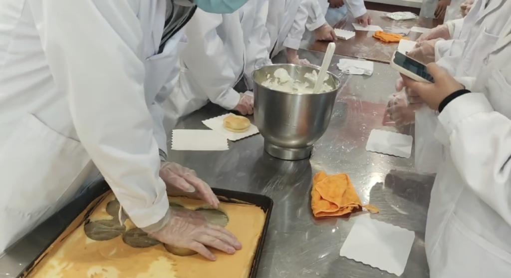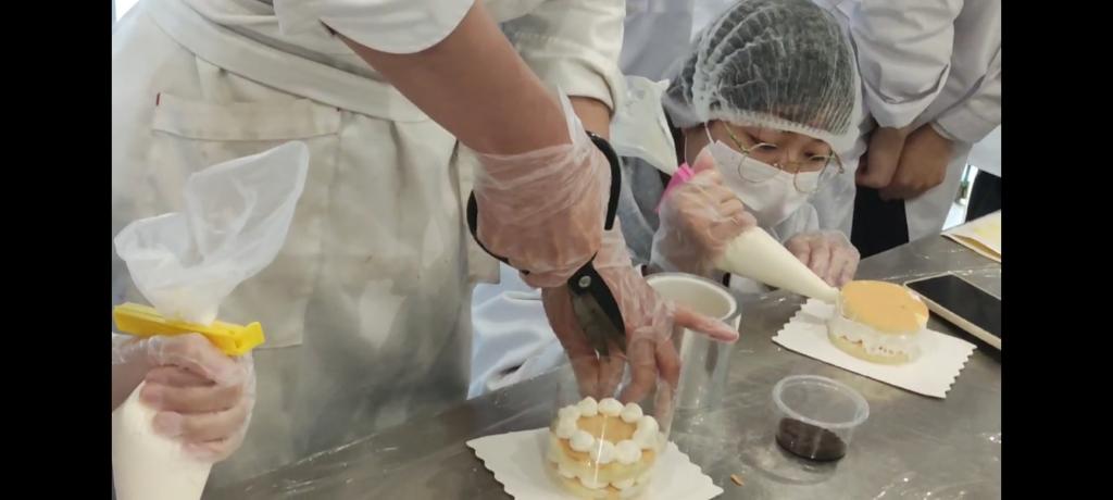 学生按照消毒、洗手、除尘、换操作服流程,在许睿老师带领下依次进入烘焙坊生产区参观体验,郑学斌老师示范讲解蛋糕制作的过程以及制胚、打发、装裱等环节中的注意事项和温度控制以及 DIY蛋糕一些亮点和创意,并和大家交流分享自己的制作心得与经验。在了解完制作原理后,学生们分组合作在老师的耐心指导下按照制胚、打奶油、挤型、裱装的流程,充分发挥个人创意和想象,分别制作不同口味的水果DIY蛋糕。