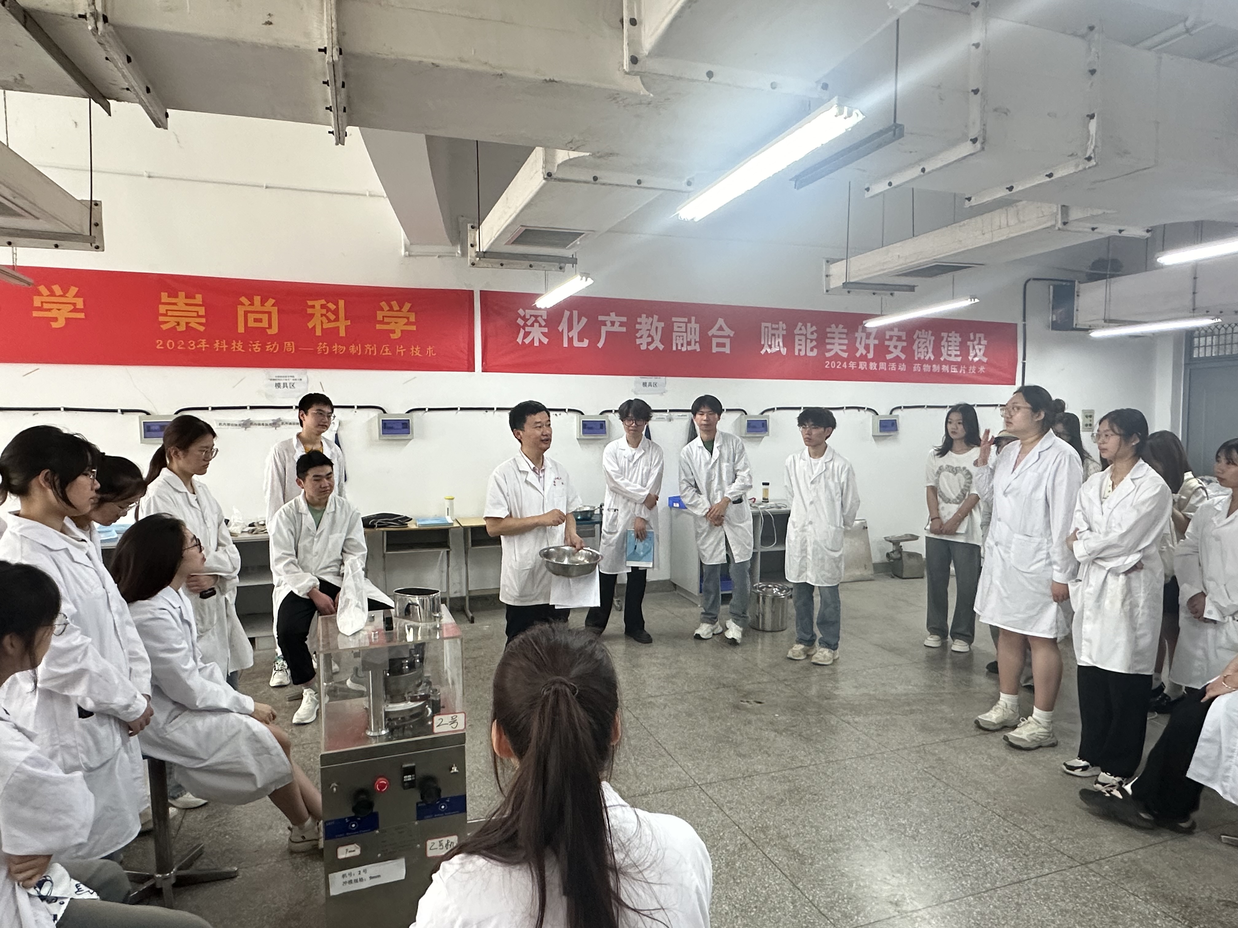 为贯彻落实“深化产教融合,赋能美好安徽建设”职教周主题精神,5月22日在鼓山校区药物制剂实训中心开展“药物制剂压片技术”科普体验活动。本次活动集中展示现代制药技术和制药设备,涉及模拟药品生产企业的片剂岗位、胶囊制备岗位和包衣岗位及其关键设备旋转压片机、全自动胶囊填充机及片剂高效包衣机等实操内容。KY开元集团官网入口第一党支部范高福工作室“双带头人”范高福、韦梦强两位老师担任讲解员,接待校内园林类专业、食品类专业及其他专业参观人员80余人次。