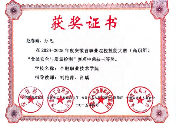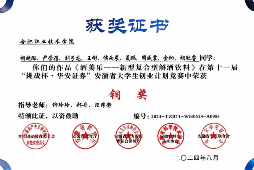 近年来,教学成果丰硕。在2024年安徽省食品设计创新大赛中,获得三等奖1项;在安徽省“互联网+”大学生创新创业大赛中,分别在2021、2022、2023铜奖各1项,2020获铜奖2项;2023年第十一届“挑战杯 华安证券”安徽省大学生创业计划竞赛获铜奖1项;在2024-2025年度安徽省职业院校技能大赛(高职组)“食品安全与质量检测”赛项中获得三等奖2项。