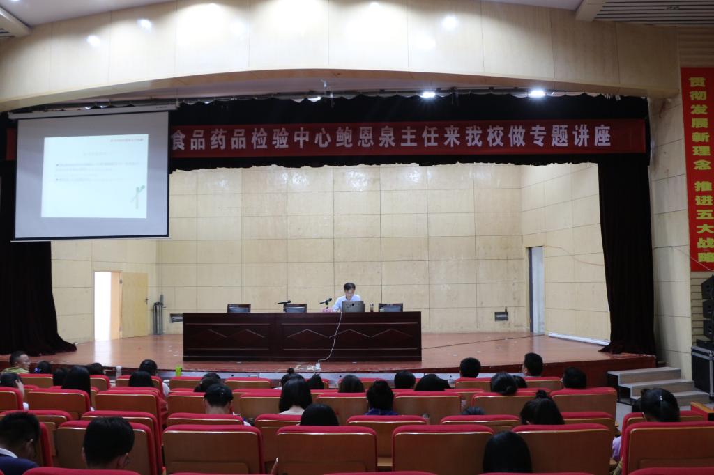 5月30日下午,由我校科技处主办,KY开元集团官网入口承办的“行业专家进校园”系列学术讲座之一——《检验在食品药品行业中的地位和作用》在大学生活动中心举行。本次讲座由合肥市食品药品检验中心主任、合肥市药品不良反应监测中心主任、主任药师、安徽中医药大学兼职教授鲍恩泉主讲,我院副院长刘修树主持,参会人员2016级药学及相关专业全体学生、2017级药学及相关专业学生、14级药高班部分代表、药学与化学教研室专业教师。