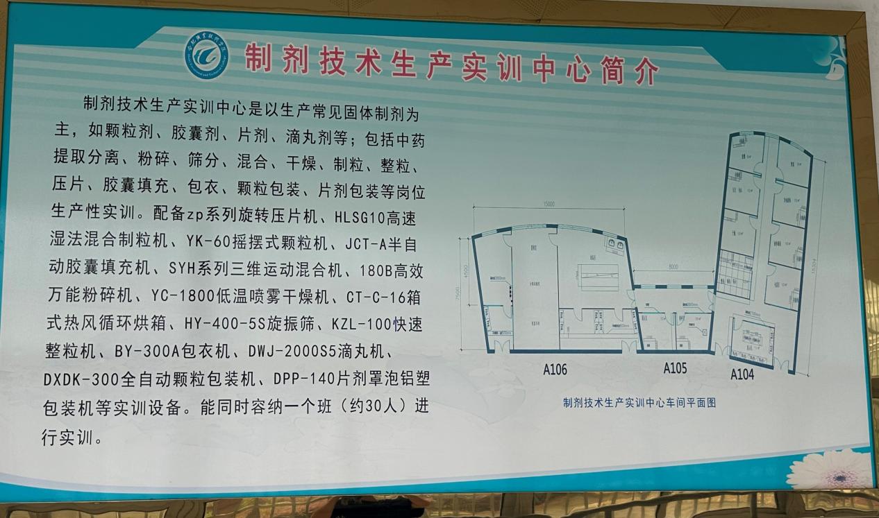 实训中心的药物制剂模块现拥有1个中药提取分离实训室、1个固体药物制剂GMP仿真实训室、1个生物制药实验室、1个制剂设备与工艺实验室、1个药剂学实训室、1个仿真模拟软件实训室;药品质量检测模块现拥有1个药物分析实训室、1个仪器分析实验室、1个色谱实验室;药学服务模块现拥有1个模拟(中)西药房、1个天然药物学实验室、1个中药鉴定实验室等共14个实验实训室。固定资产540多万,占地面积2300m2。实训中心承担药学、药品生产技术、药品质量与安全及制药工程(专升本)等多专业110多个项目的学生实训任务,各实验实训室的实验开出率近100%。