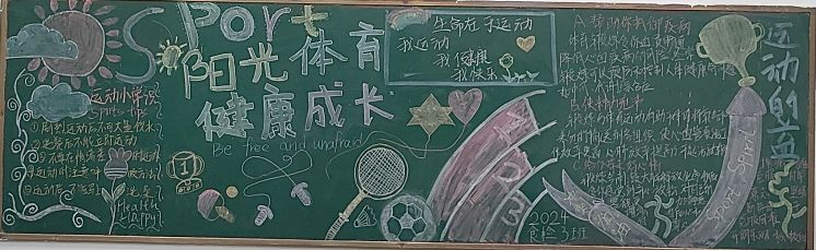 以“阳光运动与快乐成长”为核心主题,通过醒目的标题和相关的图案,让观者一眼就能明确黑板报的主旨。选择充满活力的色彩来体现运动的动感和健康的生机。整个以围绕“运动”,通过色彩、布局和创意元素的运用,传达出运动与健康的重要性,激发人们积极参与运动、追求健康生活的热情。——24药质班