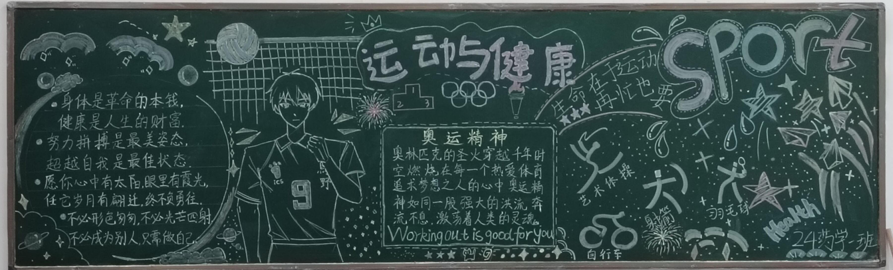 运动与健康是这次黑板报的主题。所以可以采用运动相关的图案,如跑道等,配以亮眼的标语,比如健康,活力类。辅以鲜明的颜色对比,比如金色代表胜利,橙色代表活力。整体感官上清晰,信息一目了然,鼓励大家积极参与运动,享受健康生活。——24药学4班
