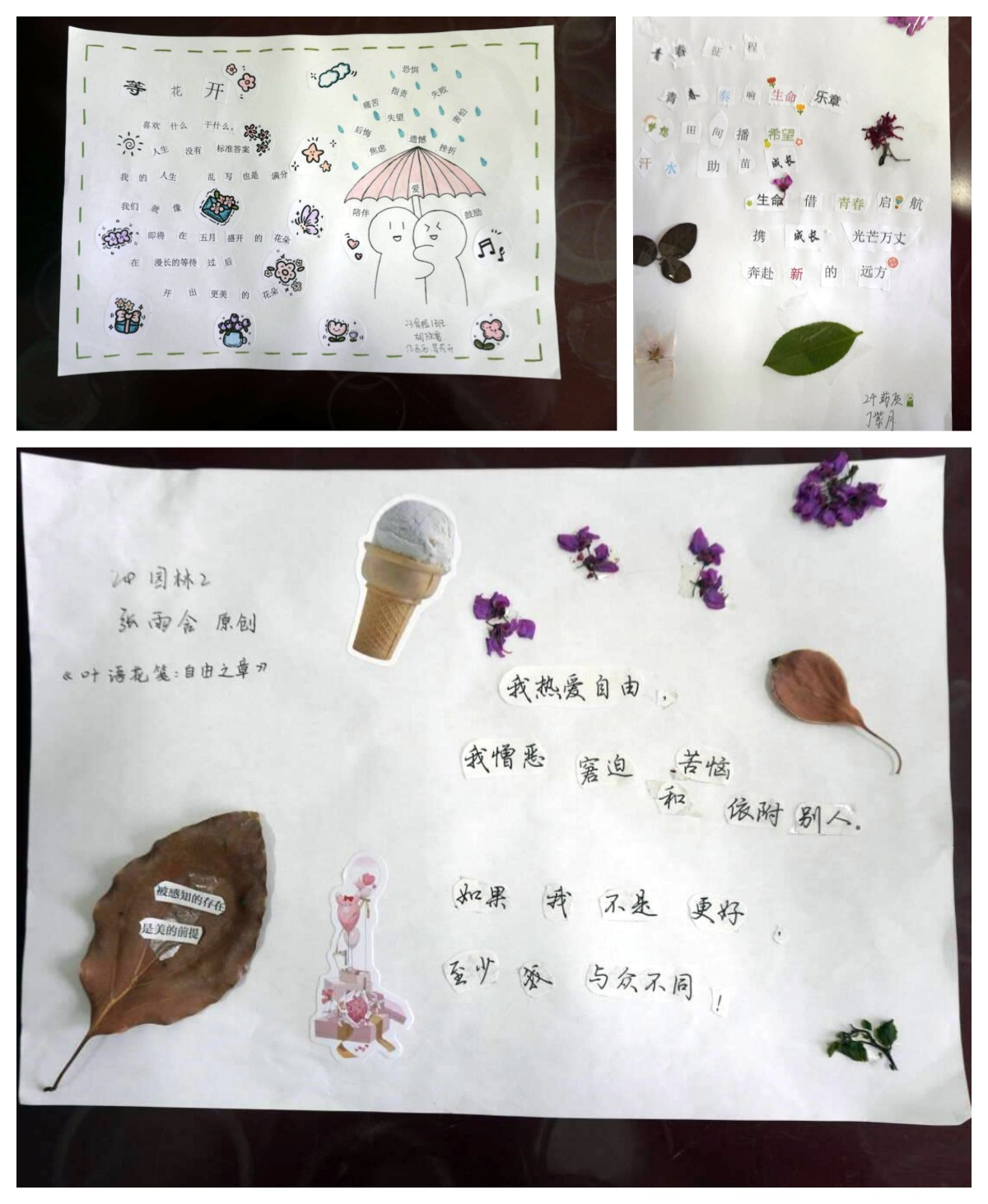 在为期12天的创作周期内,参赛者们将废弃书报化为创作素材,以剪裁拼贴的独特语言诠释青春哲思:《叶语花笺·自由之章》以植物意象编织自由宣言,《等花开》用季节轮回隐喻成长期待。参赛作品既展现当代青年的艺术创造力,更在重组旧文字的过程中完成自我对话,实现心理能量的转化与升华。经二级心理辅导站从创意构思、艺术表现、思想深度三个维度综合评审,6组作品最终脱颖而出。