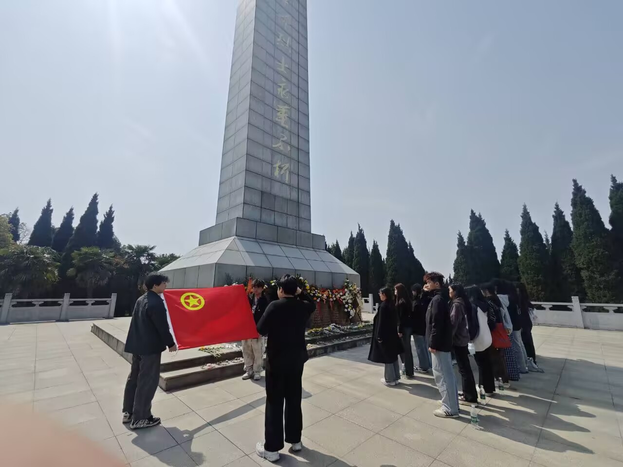 同学们怀着崇敬与肃穆之情来到南山烈士陵园。一踏入陵园,庄严肃穆的氛围便扑面而来,高耸的烈士纪念碑矗立在陵园中央,花岗岩浮雕上镌刻着“革命烈士永垂不朽”8个大字,令人肃然起敬。周围苍松翠柏环绕,仿佛在默默诉说着先烈们的英勇事迹。全体同学整齐列队,在纪念碑前向革命烈士默哀并鞠躬,表达对先烈们的深切悼念与无尽敬意。默哀毕,同学们依次向烈士敬献由自己亲手编织而成的花环。一只只花环,寄托着同学们对先烈的感恩与追思,他们轻轻将花环摆放在碑前,向长眠于此的英烈们鞠躬致敬。随后,向旭洋同学带领全体同学重温入团誓词,松柏作证,誓言铿锵,铮铮誓言响彻碑前,彰显了青年学子对革命精神的敬仰与传承。
