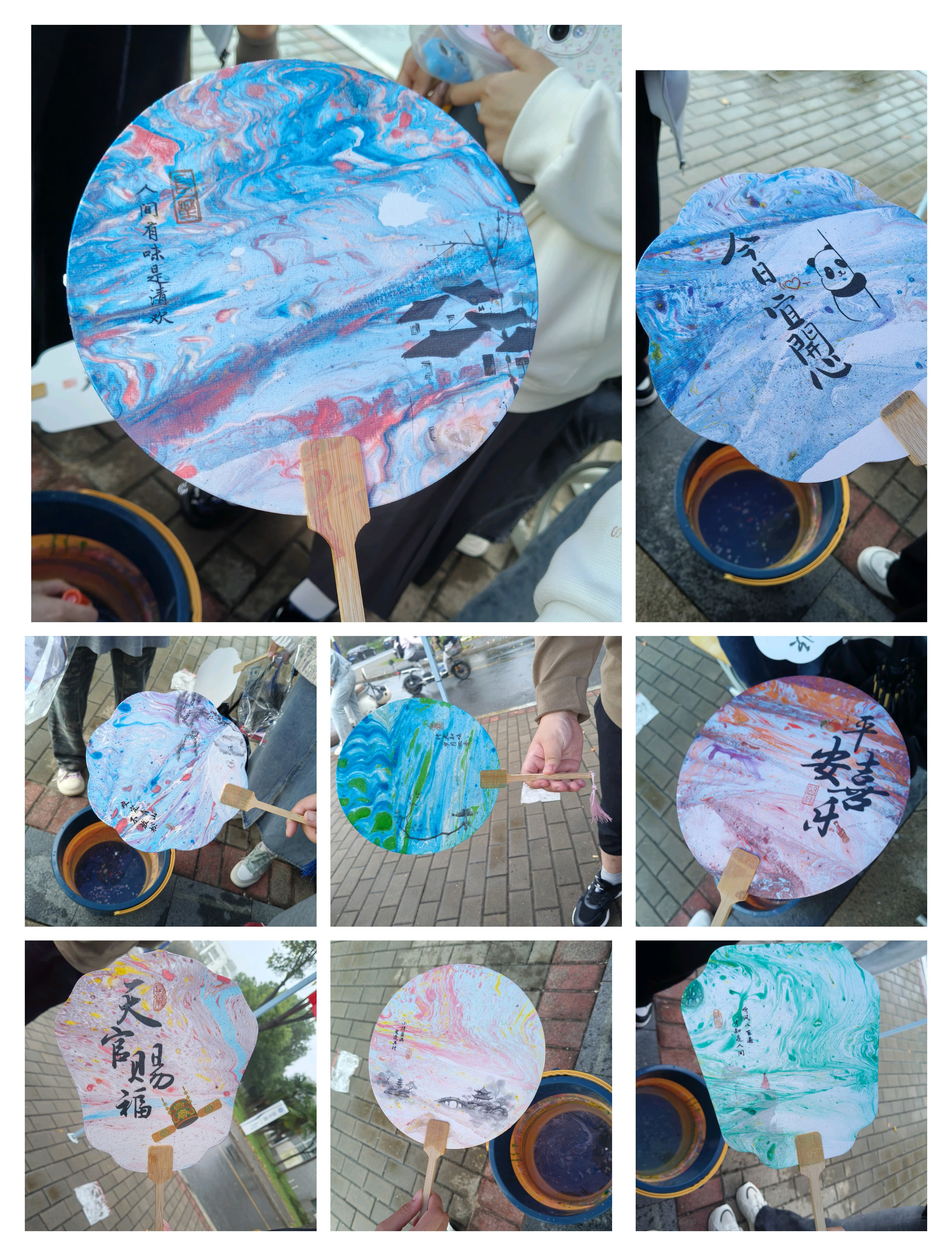 二食堂门口的 非遗漆扇 DIY” 成为焦点,同学们在志愿者指导下体验 漂漆技法,将大漆滴入水中形成纹理,再提扇定格独一无二的纹路。大一新生周同学手持漆扇兴奋地说:每把扇子都是孤品,就像我们的青春!