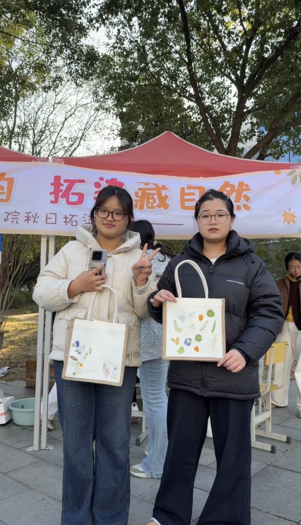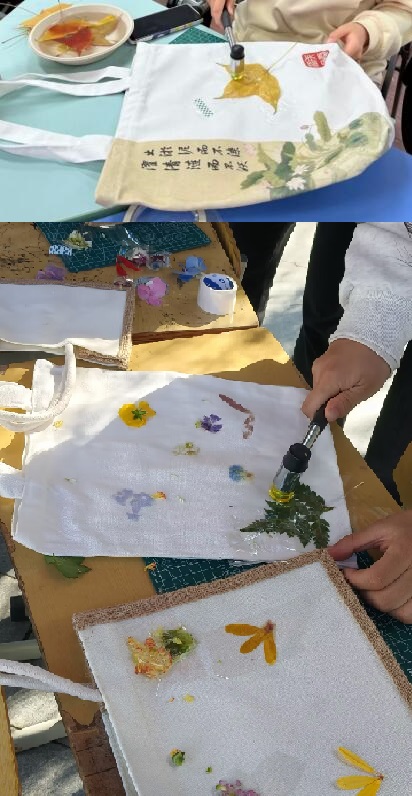 “秋韵送廉”植物拓染,把秋天“敲敲”带回家。植物拓印是一种古老的艺术形式,通过物理印染的方式将植物的形状和颜色印在织物上,拓染后的布料通风晾干后,色彩可以保存很久。活动伊始,同学们先在校园各处采集落叶。将落叶放入明矾溶液中浸泡15分钟左右以稳固色素,取出后再用纸巾吸去表面多余水分,把叶片平整置于帆布袋上,用胶带固定。接着,用小锤力度均匀地从叶边向中心轻轻敲击,使色素慢慢渗透到帆布袋上。随着敲击,树叶轮廓逐渐清晰,天然色素就这样成功拓印在帆布袋上。同学们亲手制作拓印作品,将校园中的落叶拓染到印有莲花图案和《爱莲说》名句 “出淤泥而不染,濯清涟而不妖”的帆布袋上。此次举办的植物拓印活动,是学院推动廉洁文化建设的一次生动实践。通过将非遗技艺与廉洁教育相结合,不仅让学生在轻松愉快的氛围中学习到了新的知识和技能,丰富了他们的校园生活,更在潜移默化中传播了廉洁理念,弘扬了清风正气。