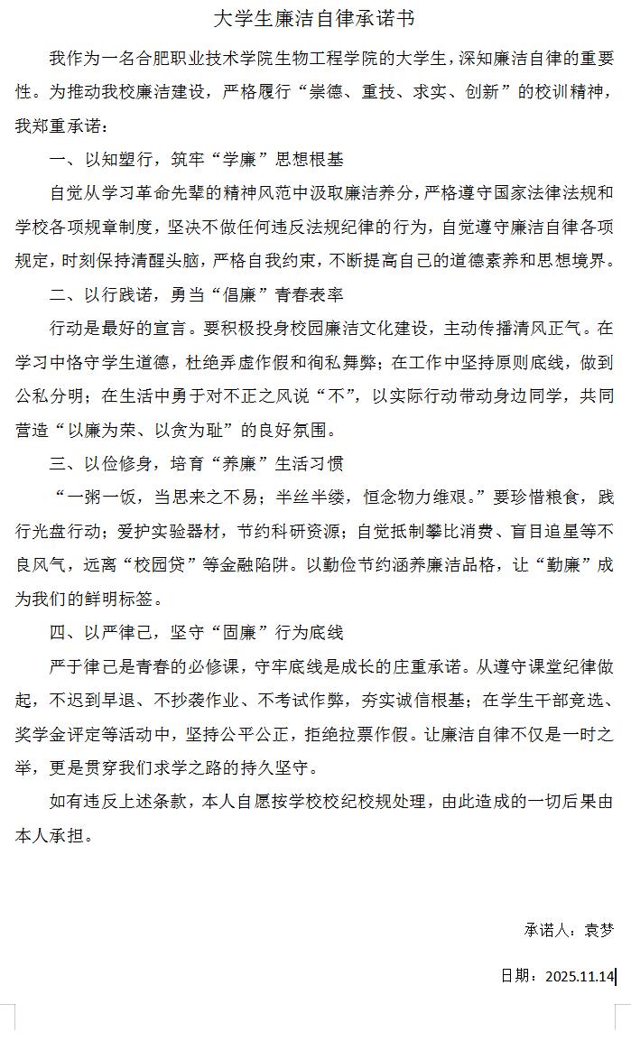 签署“大学生廉洁自律承诺书”。为引导青年学子诚实守信、履行诺言,自立自强,增强廉洁自律意识,传播正能量并营造良好的校园廉洁文化氛围。近期,我院各班级组织学生线上和线下签署“大学生廉洁自律承诺书”。廉洁之德,如明灯照亮前路,签署廉洁承诺书能让学生自发地重视廉洁,增强自身的廉洁意识,使生物学子们能够在实际行动中传承廉洁,践行廉洁,发扬廉洁。