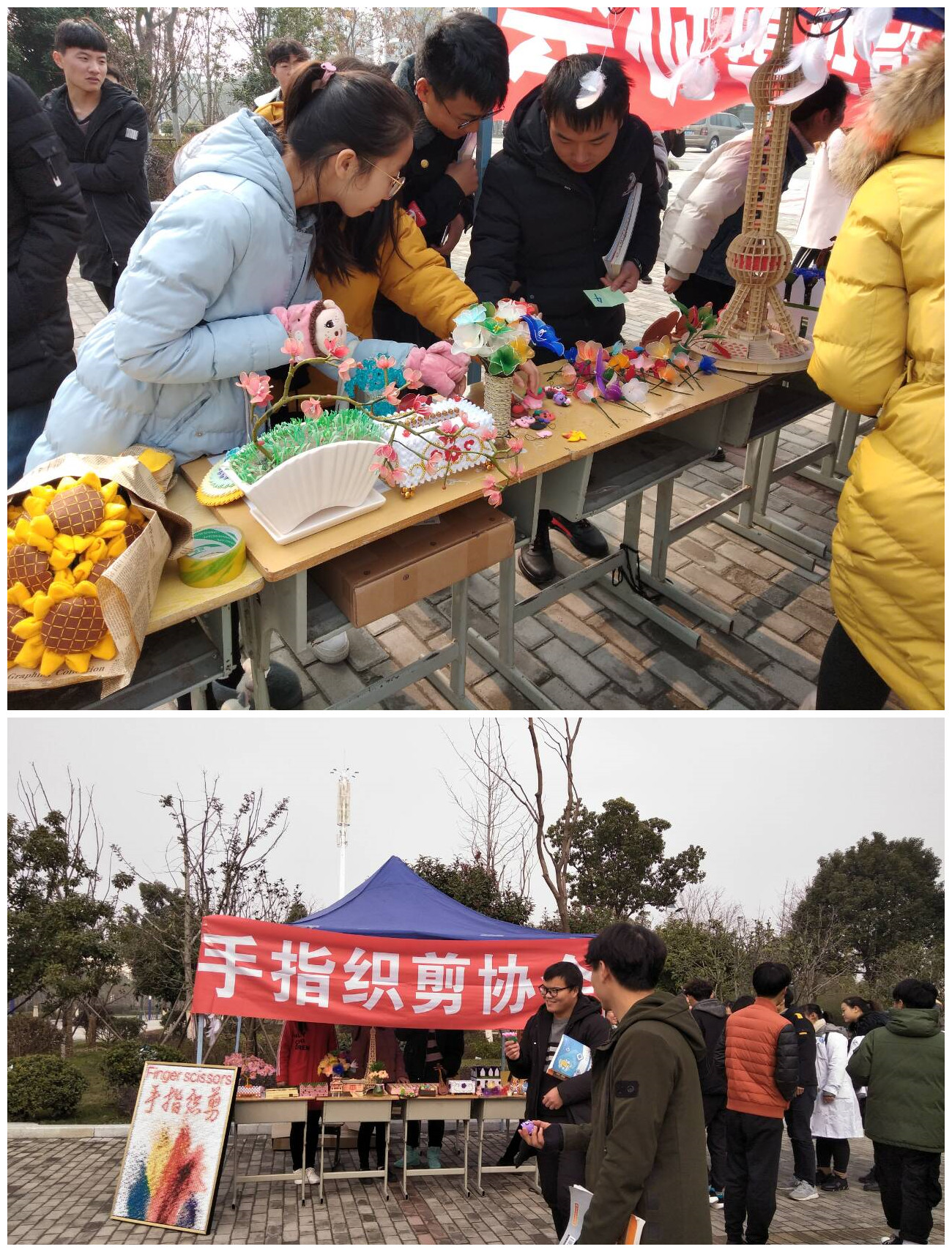 为给同学们提供一个积极创新、展现自我的平台,营造良好的校园文化氛围,全方位拓展大学生素质,我院手指织剪社团12月12日中午,学校二食堂门口举行手工作品展览活动