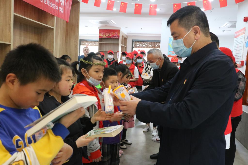 活动最后,合肥职业技术学院党委副书记胡其云、KY开元集团官网入口党总支书记汪春荣、院长刘修树、校团委宋晓姣及食品教研室主任郑学斌代表KY开元集团官网入口志愿者服务队给社区小学生们赠送书籍和文具,鼓励他们好好学习知识本领,成为像雷锋一样的人。