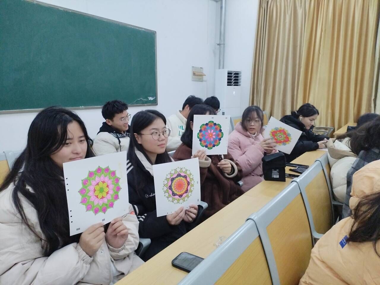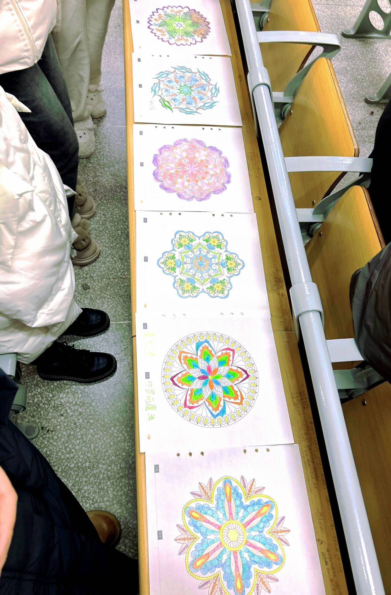 活动伊始,23级药学4班心理委员葛冬雪同学为大家普及“曼陀罗绘画”的心理知识。接着,她给同学们发放印有曼陀罗图案的纸张,并播放有关曼陀罗冥想的背景音乐,让大家闭上眼睛,跟着她的指引进行冥想,跟随内心的感受进行曼陀罗涂鸦,随着笔尖悦动,同学们的心灵自由地徜徉在色彩的海洋中,自由地去探索内心世界,自然地疗愈了内心。