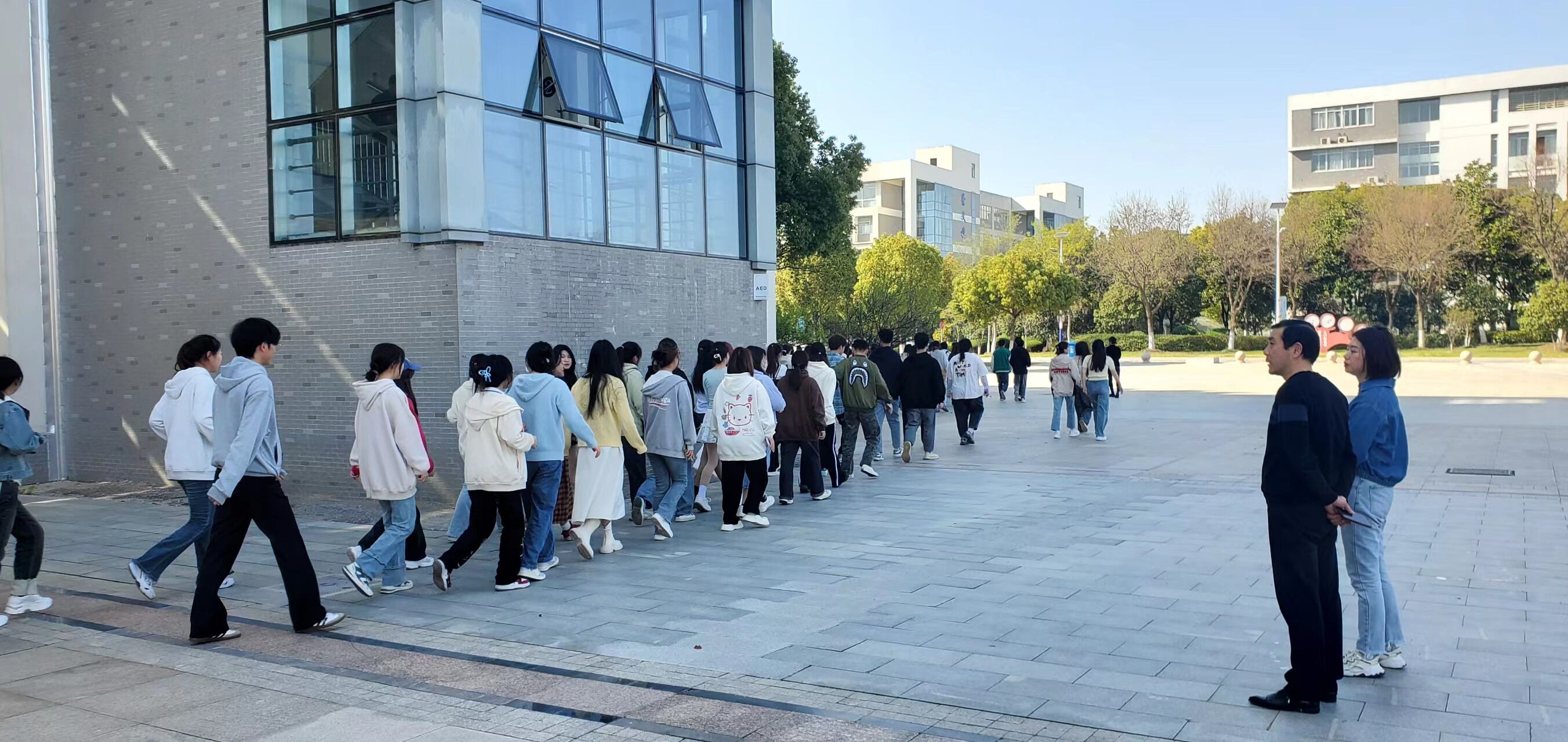 下午3点20分,随着消防警报响起,演练正式开始。辅导员迅速到达指定点位,同学们放下书本、手捂口鼻、低头弯腰,奔向教室门口,按照预定疏散路线有序撤离出教学楼,到达操场并进行清点人数,整个过程用时3分50秒。在疏散过程中,大家安静、快速、有序撤离,没有出现拥挤、推搡、踩踏等意外情况。