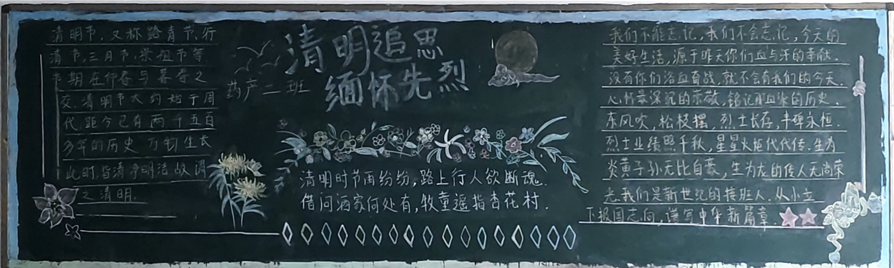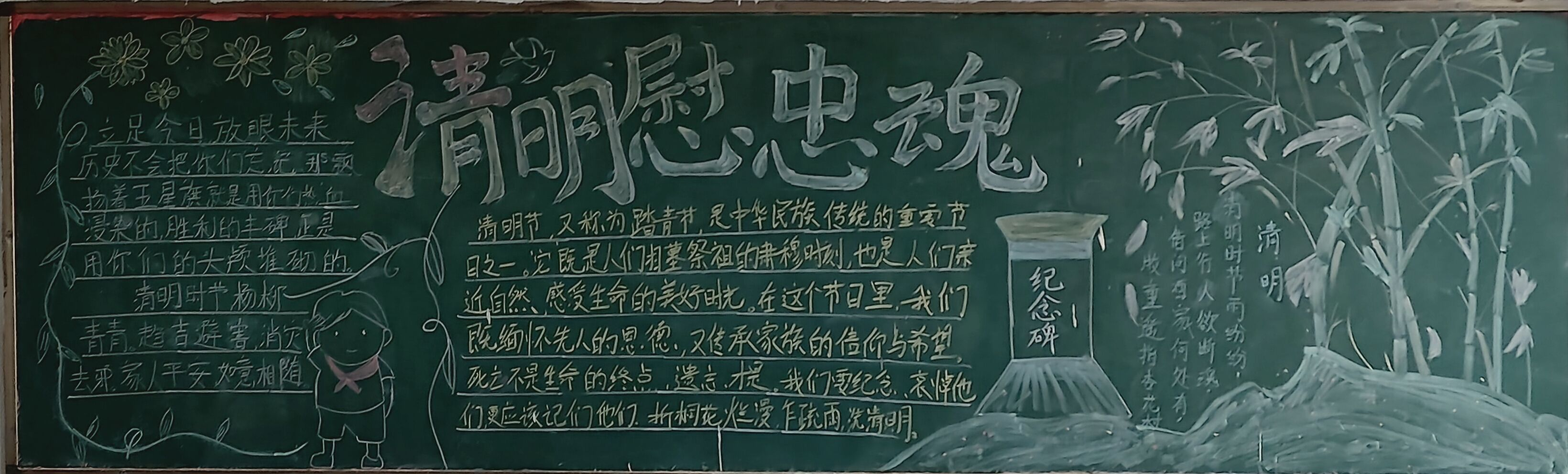 黑板报是校园建设的窗口,是展示班级文化的主要方式,同学们对清明节相关的内容展开了描述与绘画。各班级紧紧围绕主题内容精心准备,积极参加。