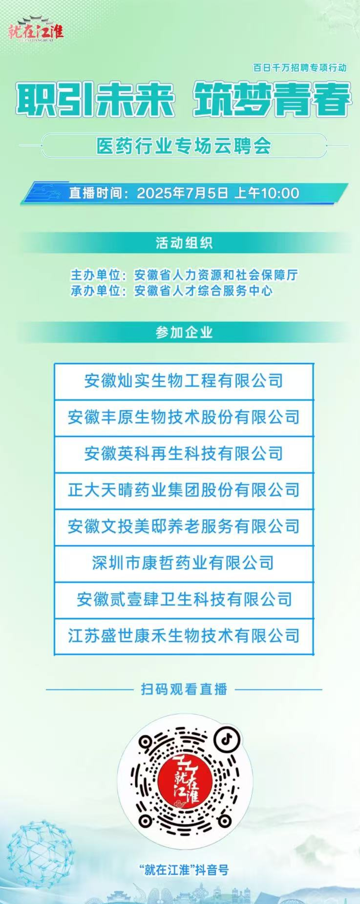 就在江淮| 2025年“百日千万招聘专项行动”之医药行业专场云聘会,7月5日10:00,云端送岗!