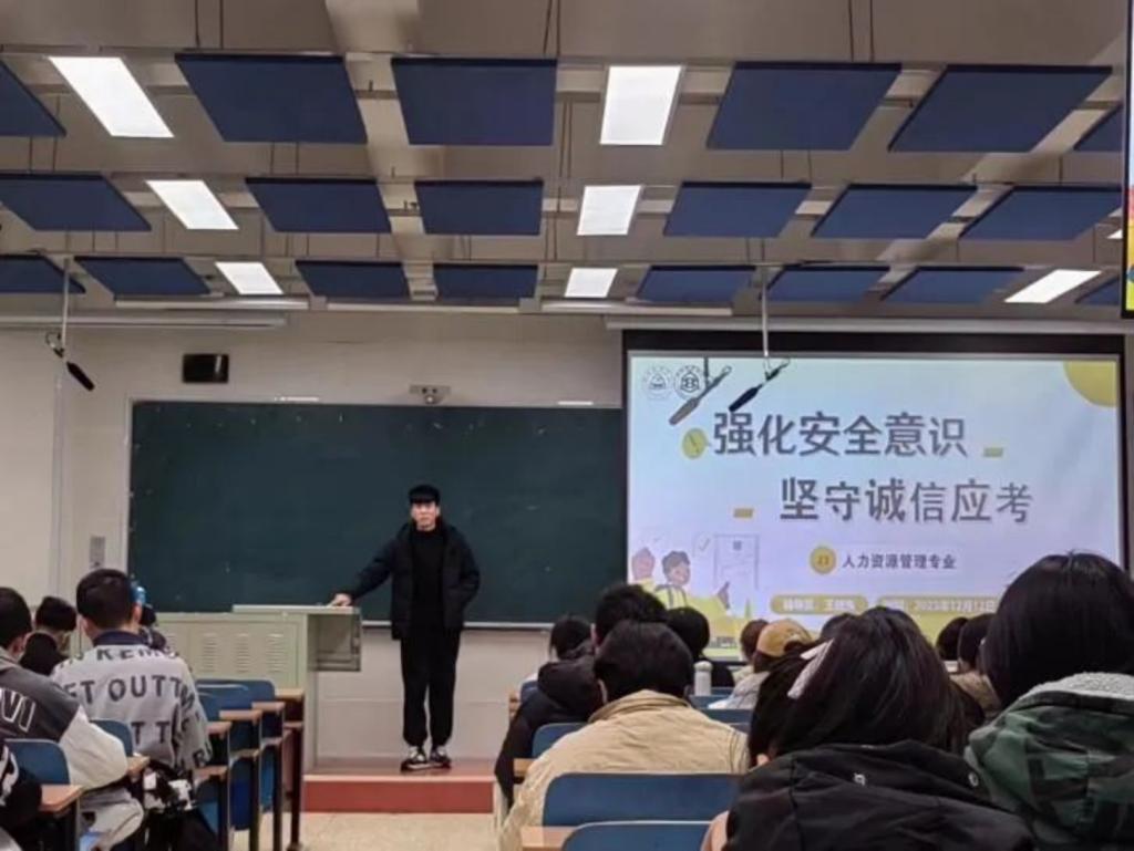 为进一步提高同学们的安全意识和诚信意识,加强考试管理,推动营造公平公正的考试环境,12月12日下午,必赢线路检测中心人力资源管理专业2023级开展“强化安全意识,坚守诚信应考”主题班会。本次班会由辅导员王晓东老师策划主持,2023级人力资源管理专业全体同学参加。