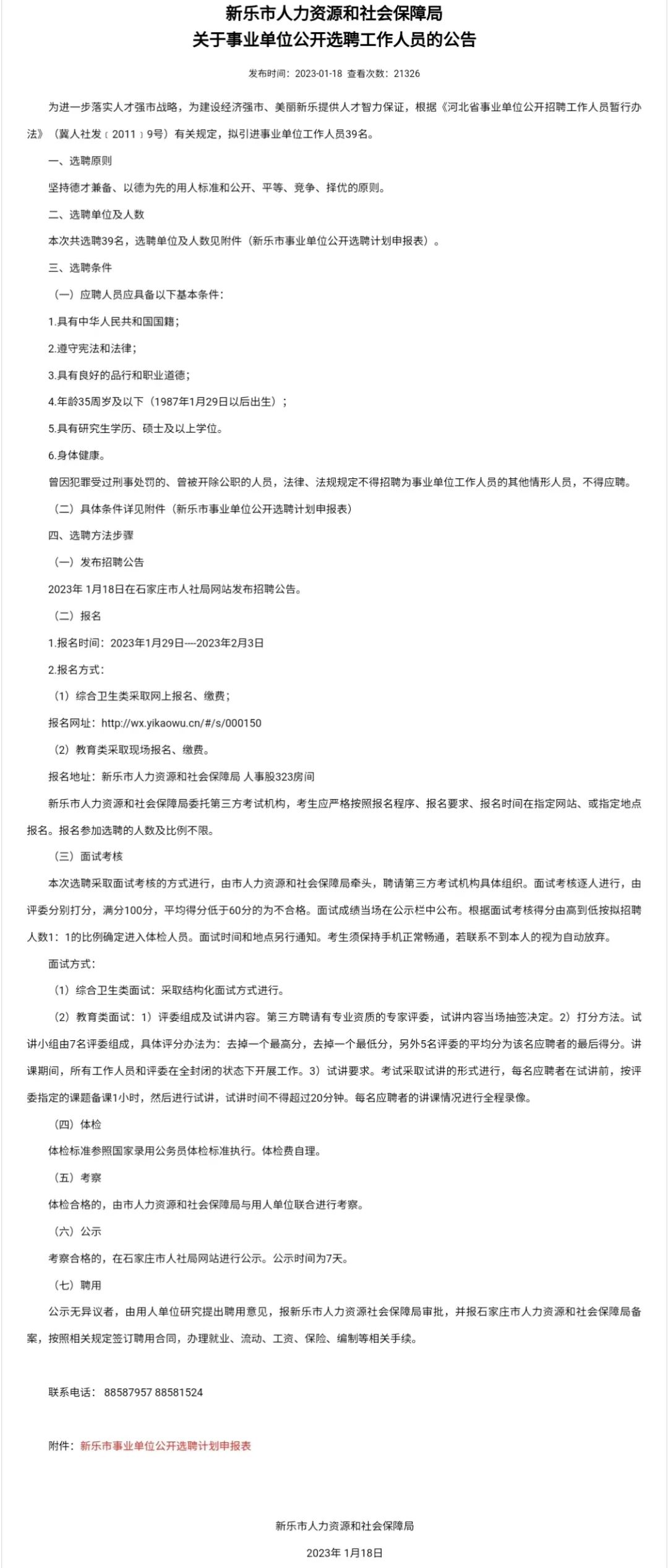 新乐市事业单位公开选聘工作人员39名。具体招聘人数和岗位条件详见↓↓↓