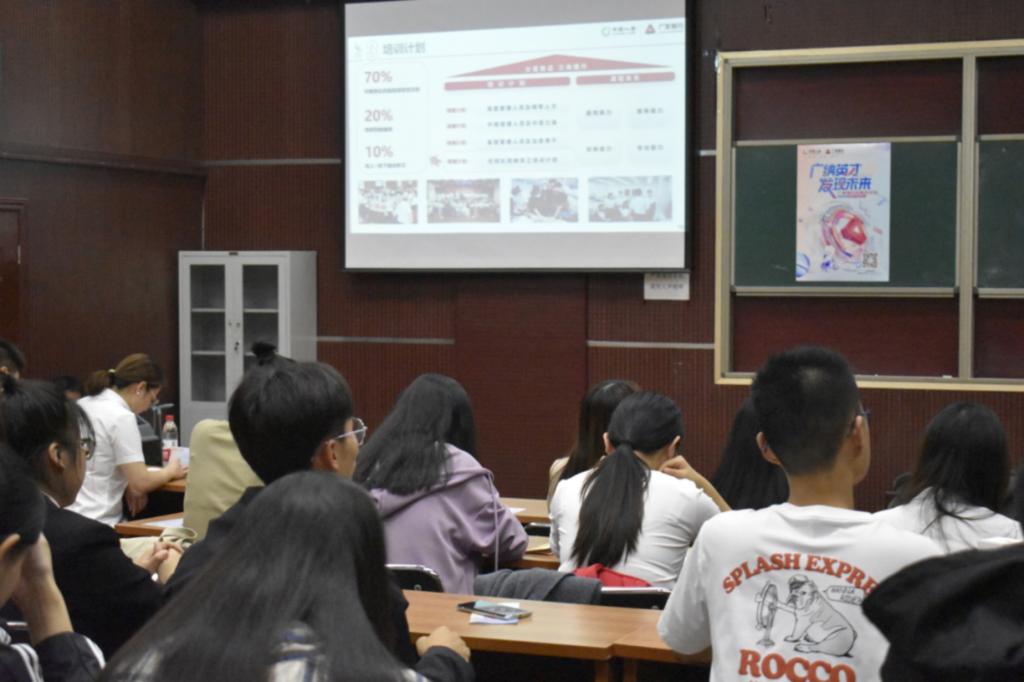 宣讲期间,王兆鑫老师首先向同学们介绍了广发银行的概况,指出了“建设业务完善,功能多元,特色鲜明,同业一流的商业银行”的公司愿景,并介绍了全行在岗员工人数、公司规模、公司获得奖项以及公司的重点发展业务,有助于加深同学们对公司的了解,明晰今后工作方向,从而更有针对性的发挥自己的能力,实现自我价值。紧接着,他向同学们讲解了公司的校招计划。其中重点强调了岗位类别里的营销精英培训生及其六个发展方向,并通过介绍包括肖蓉知、陈倩等在内的通过校招进入公司的优秀人才,在帮助同学们深刻了解公司培训计划的同时,也让他们意识到抓住校招机会的重要性。最后,会议进入问答环节,同学们针对宣讲会内容提出了相关问题,人力资源管理经理张洋老师对提问同学做出了耐心解答,让同学们对公司的具体情况有了更深刻地了解,增长了求职经验,受益颇多。