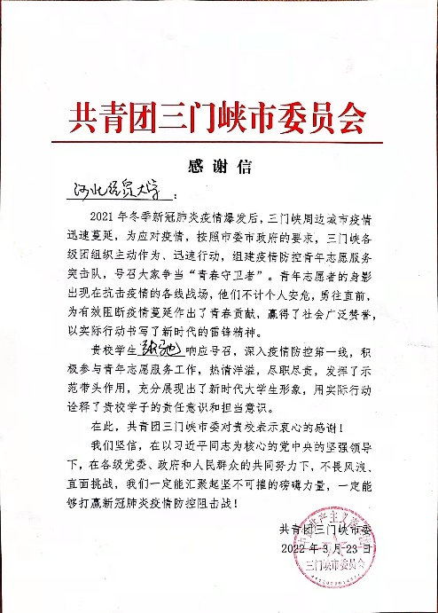 今年3月,她收到这封感谢信,感到十分荣幸。作为志愿者为疫情防控工作贡献自己的一份力量,努力在烈日炎炎的夏天,坚守在寒风凛冽的冬天,让她明白了志愿服务活动带给她的不仅仅是一种精神,更培养了自己的耐力和信念,同时她也看到了自己的潜力。在接下来的日子里,她会继续努力,严格要求自己,继续投身于为人民服务中,争做新时代有为青年。