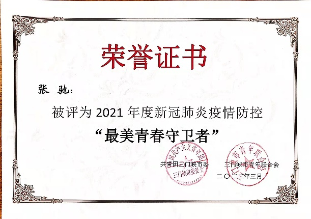 张驰,现就读于2021级智慧工商一班,她积极践行“在服务他人的过程中成就自我”的志愿宣言。假期在家,她积极参加志愿服务活动。2021年8月,她在黄河公园核酸检测点作为志愿者参与5天的全员核酸检测任务,负责志愿者的统筹规划,登记身份信息等,并与医护人员一起入户,为行动不便的老人进行核酸检测。2021年12月23日至2022年1月31日,她在湖滨区卫生健康委员会对密切接触者进行信息排查。同时,负责小区进出人员的体温检测和信息登记工作。