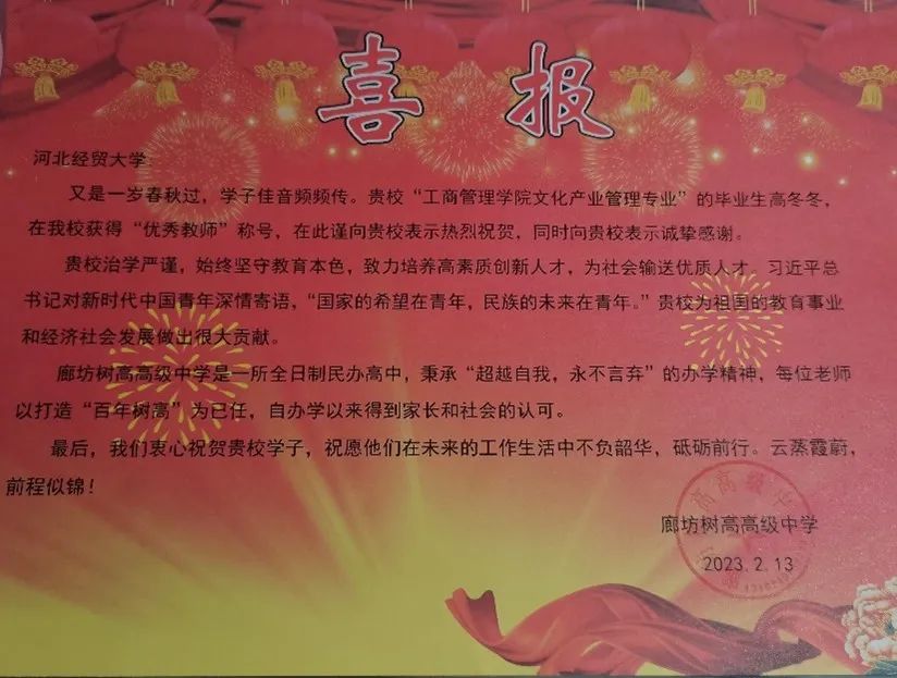 又是一年春秋过,学子佳音频频传。必赢官网文化产业管理专业毕业生高冬冬获得廊坊树高高级中学“优秀教师”荣誉称号。