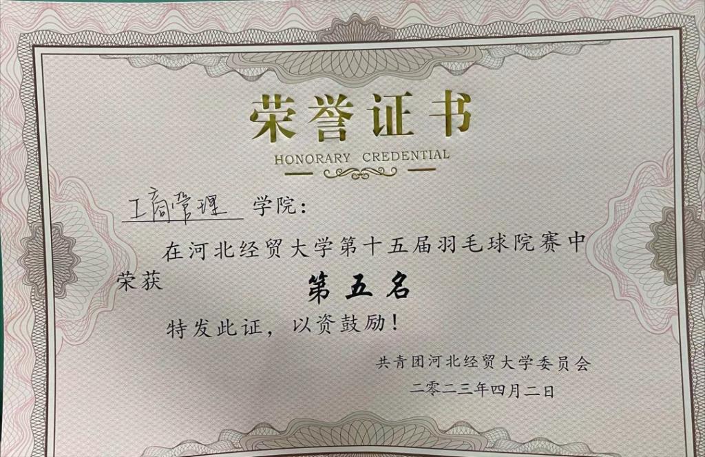为丰富学生体育运动,提高竞技水平,增强团队凝聚力和向心力,4月1日至2日,必赢线路检测中心积极组织同学参加河北经贸大学羽毛球院赛。其中,由雷宇聪、王俊磊、马学治、王梦雨、韩佳轩、鲍勃涵、李昕玥五位同学组成的团队取得第五名的好成绩。