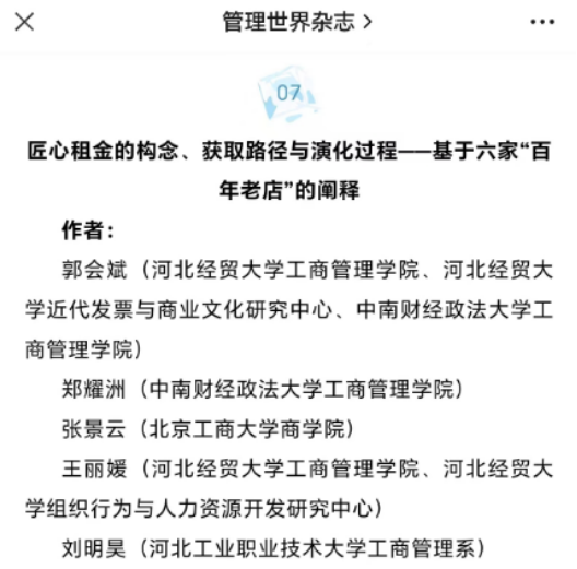 近日,必赢线路检测中心郭会斌教授、王丽媛副教授等的研究成果《匠心租金的构念、获取路径与演化过程——基于六家“百年老店”的阐释》在《管理世界》期刊2023年第7期上发表。