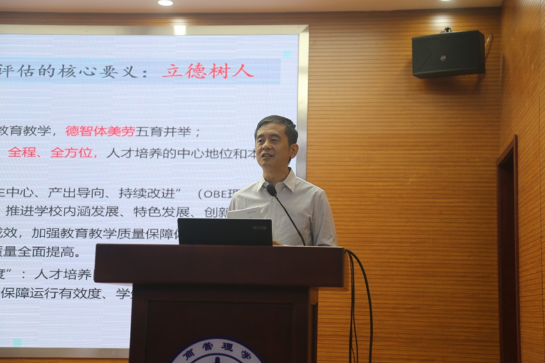 王胜洲副院长带领全体教师学习本科教育教学审核评估相关材料,介绍学校自评自建过程中主抓的工作内容和取得的成效,强调对接下来的线上、线下评估工作要进一步提高认识,高度重视,做好评估工作的相关准备,进一步完善“学生中心、产出导向、持续改进”的质量文化。