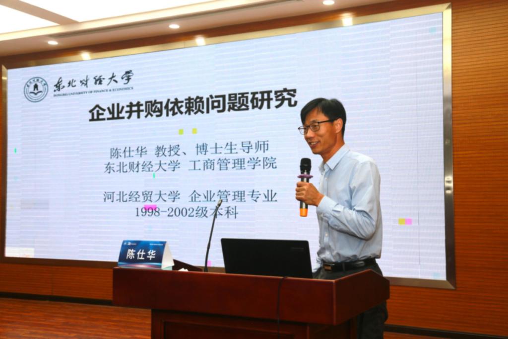 河北经贸大学校友、东北财经大学经济与社会发展研究院陈仕华教授作题为 “企业并购依赖问题研究”的主题报告。他从知识基础理论和成长压力理论两个视角提出研究假设,并运用上市公司数据和并购交易事件进行了实证检验,研究了企业并购依赖与并购选择以及并购绩效之间的关系。该研究最大的创新之处在于其理论创新,即将知识基础理论和成长压力理论结合起来研究企业并购依赖问题,为企业并购问题的理论研究方面提供了新的视角。最后,陈仕华教授建议学者们在未来可以从外生因素的角度、企业并购依赖的前因和影响后果等角度进行拓展研究。