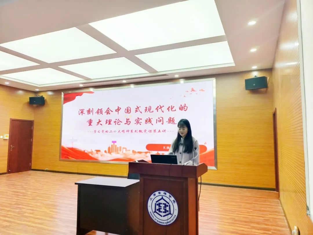 2023级工商管理专业研究生王琳珂主讲本届第五期微党课“深刻领会中国式现代化的重大理论与实践问题”。通过新时代新征程中国共产党的使命任务引出本次微党课主题,重点强调了以中国式现代化全面推进中华民族伟大复兴是二十大报告的重要内容,是新时代新征程中国共产党的使命任务的应有之义。从顶层设计与实践探索的关系、战略与策略的关系、守正与创新的关系、效率与公平的关系、活力与秩序的关系、自立自强与对外开放的关系六方面学习习近平总书记的重要文章《推进中国式现代化需要处理好若干重大关系》。通过一则大学生拍摄的“我眼中的中国式现代化”视频,指出作为新时代青年,我们必须认真学习中华文明史,学习党史、新中国史、改革开放史、社会主义发展史,厚植家国情怀,坚定中国特色社会主义道路自信、理论自信、制度自信、文化自信,增强历史责任感和使命感,为中国式现代化注入强劲青春动力。