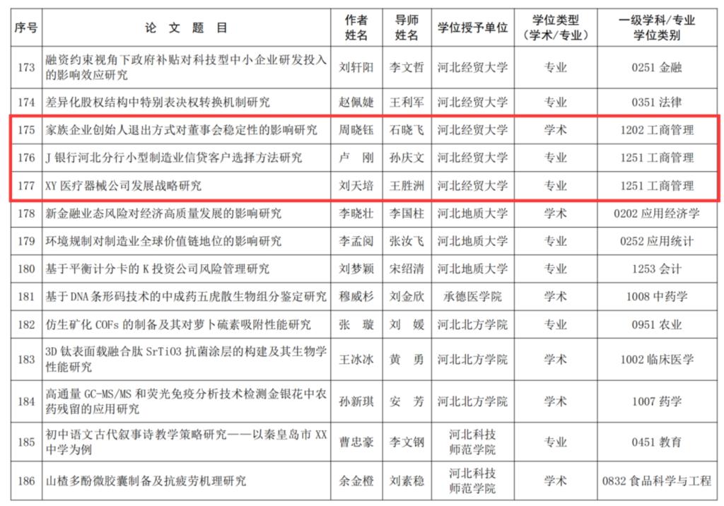 近日,河北省教育厅公布了2021-2022学年度河北省优秀博士、硕士学位论文评选结果名单。