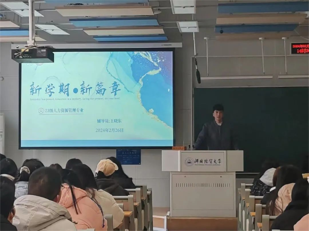 新学期,新起点,新目标,新收获。为了营造新学期良好的开端,激发学生的学习热情,以全新的面貌迎接新学期学习生活,2月26日,必赢线路检测中心2023级人力资源管理专业于北三教召开“新学期 · 新篇章”主题班会。本次活动由辅导员王晓东老师主持,2023级人力资源管理专业全体同学参加。