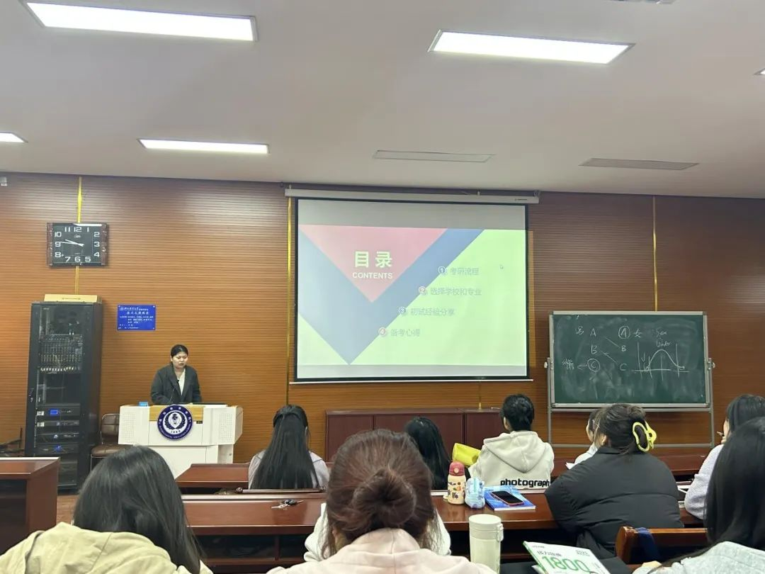 八位研究生党员代表分别从自身考研历程、心得体会、研究生期间学习生活状态三个方面进行了分享,对“目标院校选择”、“考研计划制定”、“科目答题技巧”、“考研心态调整”以及复试注意事项等方面进行了细致讲解。他们强调,大家一定要独立思考,选取专业和院校时不能盲从,建议同学们不要只局限于与考研专业相关的书籍,应多读不同类型的书,拓宽视野。随后,支部党员与立志考研同学就相关问题进行面对面座谈交流,针对在场学生的疑问给予详细解析并给同学们送上祝福,同学们认真听讲,交流会全程气氛热烈融洽,掌声不断,同学们纷纷表示收获颇丰。