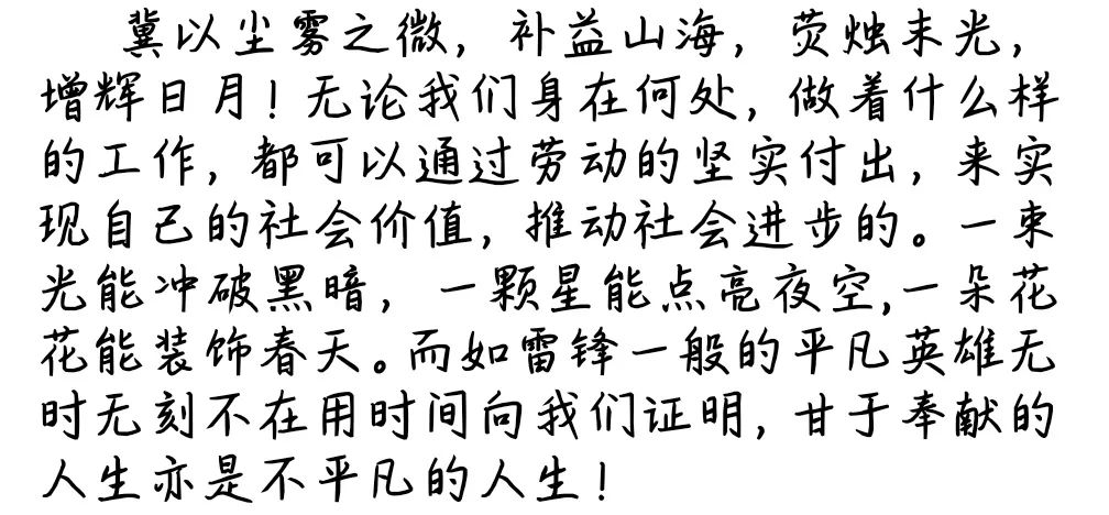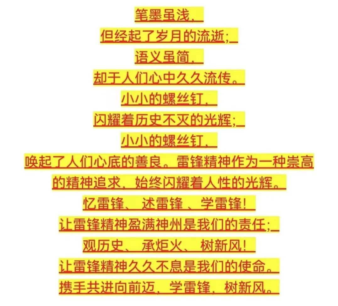 为贯彻落实习近平总书记关于深刻把握雷锋精神的时代内涵的重要指示,大力弘扬、传承雷锋精神,深化拓展新时代文明实践和学雷锋志愿服务工作,营造全民志愿的浓厚氛围。必赢线路检测中心团委心理健康中心以三月学雷锋为契机,3月8日-14日组织了“雷锋精神亮时代,随手小事暖人心”为主题的创作比赛。