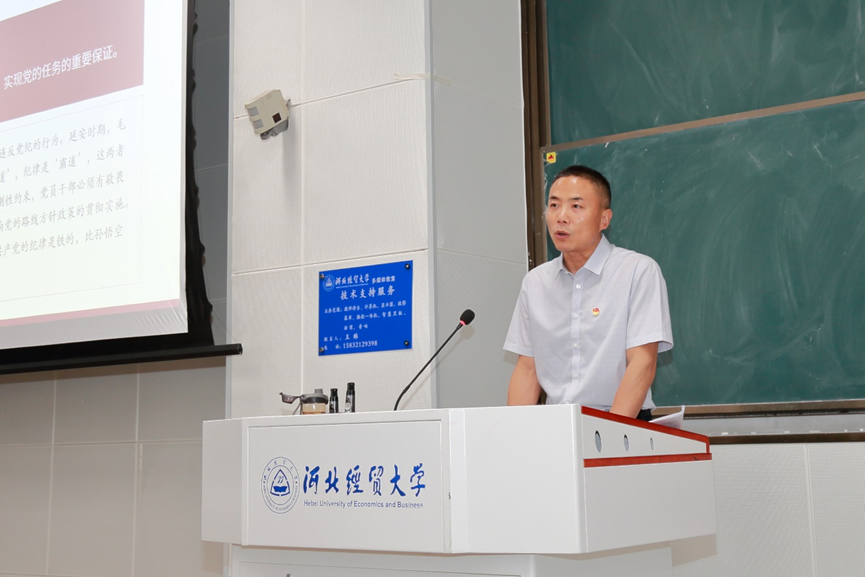 党委组织部正处级组织员贾国强以学院不同职位办公室面积的严格把控作为引入,为大家深入展开关于党纪的讲解。他首先讲解了全党正在开展的集中性纪律教育的重大意义,带领大家重温了习近平总书记以及党的历代主要领导人关于党的纪律建设的重要论述,通过对《中国共产党纪律处分条例》的深入分析,着重了强调我们需要明确党的纪律规矩是什么,进而让我们清晰地知道能做什么,不能做什么,把遵规守纪刻印在心,内化为言行准则,进一步强化纪律意识,加强自我约束,提高免疫力,增强政治定力、纪律定力、道德定力、拒腐定力,始终做到忠诚、干净、担当。接着,他介绍了党纪建设过程中的动人事迹,提出我们应铭记历史,发挥榜样的力量,以模范人物的典型事迹作为我们前进的指向标,党纪不仅仅是一条条冰冷的文字,更承载着百姓对中国共产党的信任和尊重。最后,他指出纪律是一面镜子,时刻提醒我们要保持清醒和冷静,希望同学们知底线、守敬畏、勤学习,坚定听党话跟党走的政治信念,在强国建设、民族复兴伟业中贡献自己的力量。