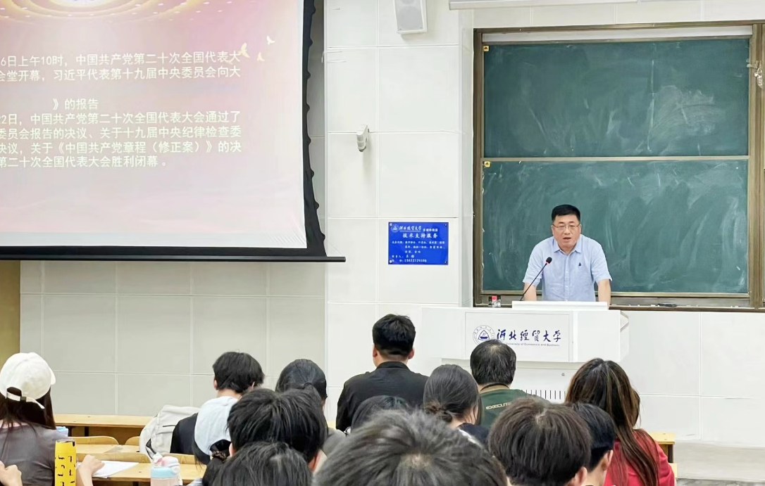 正处级辅导员马章山围绕党的二十大报告重要内容,开展党的二十大精神专题学习。他系统介绍了党的二十大提出的一系列新观点、新论断、新思想,带领大家深刻感悟党的二十大报告这一马克思主义纲领性文献的丰富内涵。随后,他对“三个务必”、“归根到底是两个‘行’”、“第二个回答”、“党的中心任务”等概念进行了深入剖析并强调 “党章是全体党员言行的总规矩和总遵循”,作为入党积极分子要认真学习党的章程,领悟党章的深刻内涵。最后,他要求同学们认真学习研读二十大报告,准确把握二十大精神实质,深入了解其内涵和意义,弘扬伟大建党精神,把学习的成效不断转化为工作、学习的动力,把学习党的二十大精神的成果转化为奋进新征程、建功新时代的实际行动。