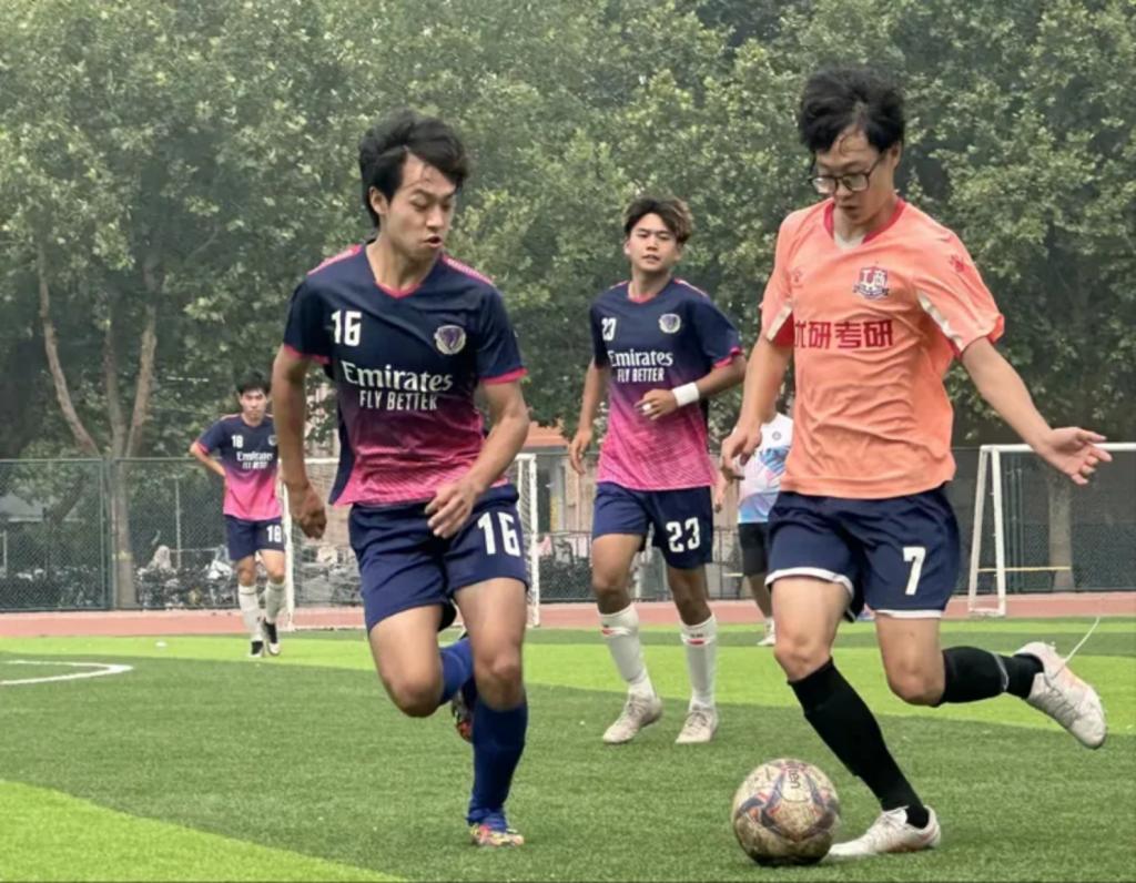 在与统数学院的八强赛中,工商足球队在前60分钟就打入4球,然而统数学院的队员们没有放弃,连续的任意球破门将比分追到4:3,最终球员们注重防守成功进入半决赛。