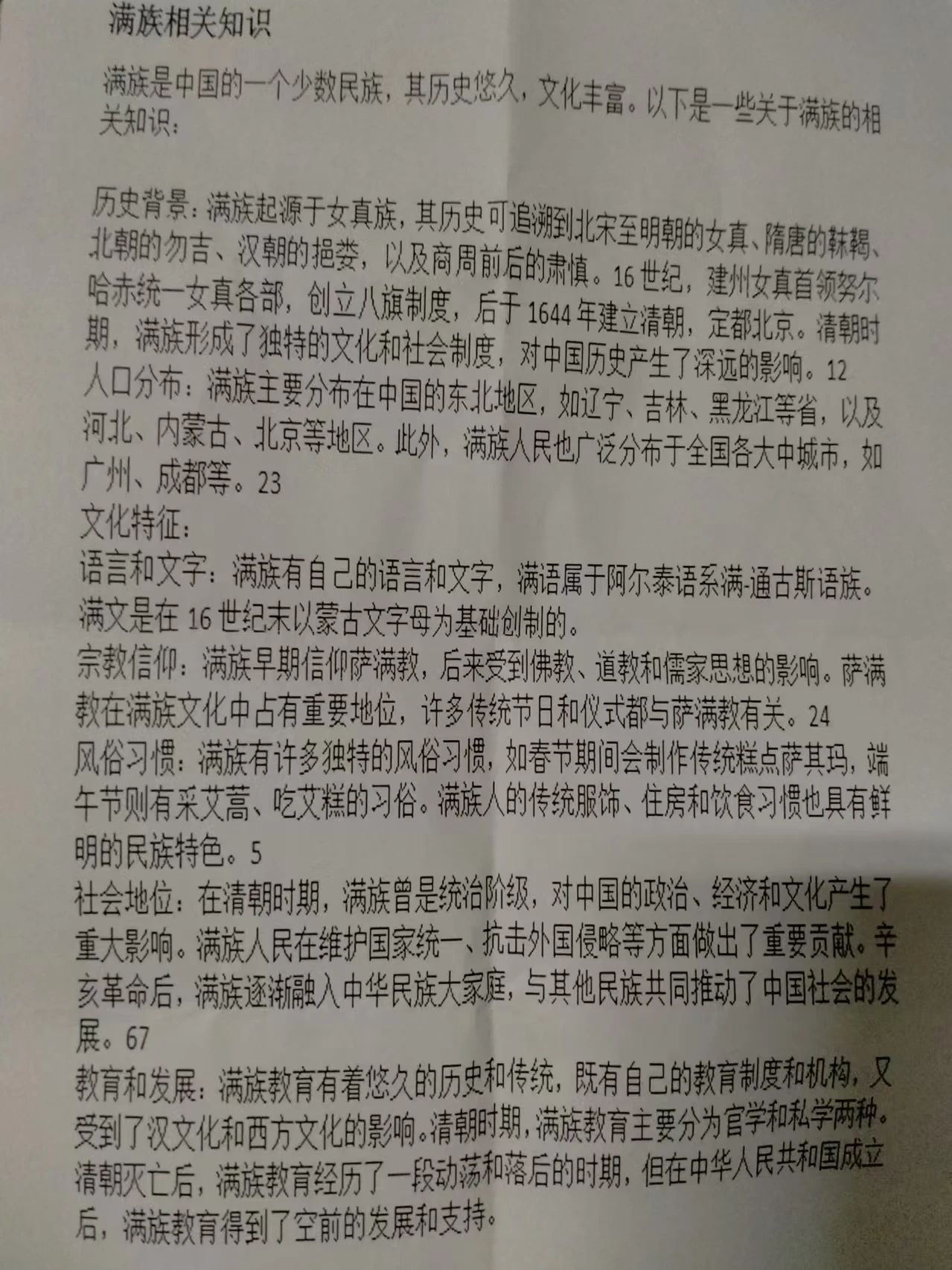 在未来的发展中,我们应该进一步加强对满族文化的研究和创新,推动其在现代社会中的发展和繁荣。同时,我们还应该加强对满族文化的教育和普及,让更多的人了解和喜爱满族文化,共同推动中华文化的繁荣和发展。通过本次社会实践,我深刻意识到作为新时代青年,我们应该积极参加文化交流活动,增进不同民族之间的相互了解,尊重各民族的语言、习俗,让民族团结之花常开常盛。