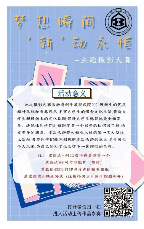 3.作品可以是个人照、打卡照、抓拍照等与学校相关的照片(必须本人出镜)。要求作品内容主题鲜明、健康向上。