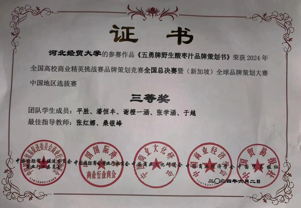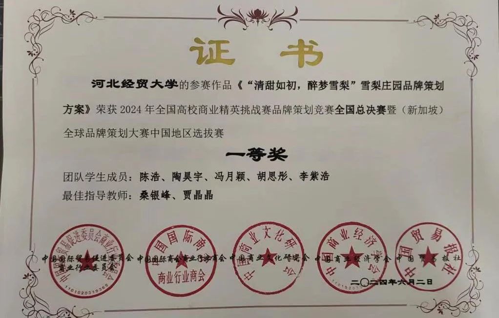 6月2日,由全球华人营销联盟(GCMF)、中国国际贸易促进委员会商业行业委员会、中国国际商会商业行业商会、中国商业文化研究会、中国商业经济学会和中国贸易报社共同主办,新加坡营销协会、(香港)营销师公会、台湾行销科学学会、(台湾)中华国际经贸研究学会协办,中国国际贸易促进委员会商业行业委员会承办的2024年全国高校商业精英挑战赛品牌策划竞赛全国总决赛暨(新加坡)全球品牌策划大赛中国地区选拔赛顺利举行。经过两天激烈的角逐,必赢官网两支参赛团队在桑银峰和贾晶晶两位老师的指导下从600余所高等院校的7000余支参赛队伍中脱颖而出。其中,“雪梨庄园品牌策划工作室”(陈浩、陶昊宇、冯月颖、胡思彤、李紫浩)团队获得全国总决赛一等奖;“五勇品牌策划工作室”(平胜、潘恒丰、谢橙一涵、张学涵、于越)团队获得全国总决赛三等奖。