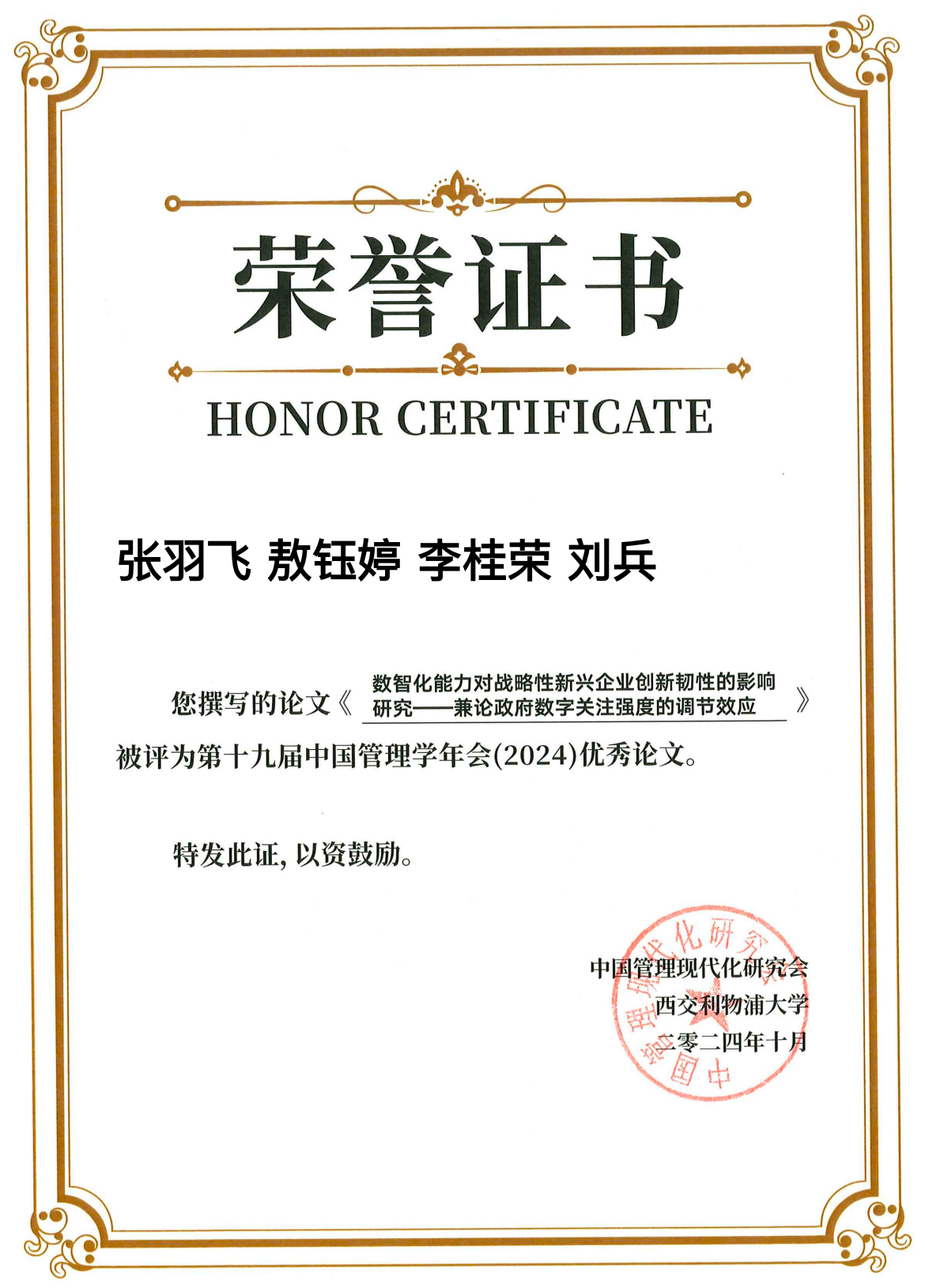 2024年10月25日-27日,由中国管理现代化研究会主办、西交利物浦大学承办的第十九届(2024)管理学年会在江苏省太仓市西浦创业家学院隆重举办。来自北京大学、复旦大学、厦门大学等多所高校和来自海内外管理学界逾千位专家学者、政府及企业代表齐聚苏州,围绕“数智化转型与生态管理”主题,共同探讨人工智能时代背景下学术界和企业界的前沿理论和最佳实践。必赢官网张羽飞博士、李桂荣教授、刘兵教授(通讯作者)及会计学院敖钰婷的合作论文《数智化能力对战略性新兴企业创新韧性的影响研究——兼论政府数字关注强度的调节效应》入选“技术与创新管理”分论坛,并荣获本届年会优秀论文奖。