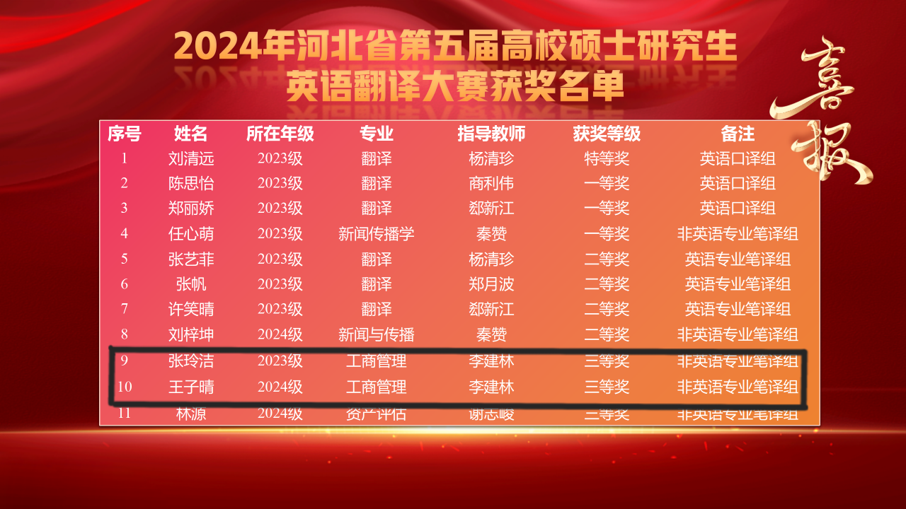 近日,河北省第五届高校硕士研究生英语翻译大赛决赛在唐山顺利落下帷幕。必赢官网2023级研究生张玲洁和2024级研究生王子晴在此次比赛中获得非英语专业笔译组三等奖