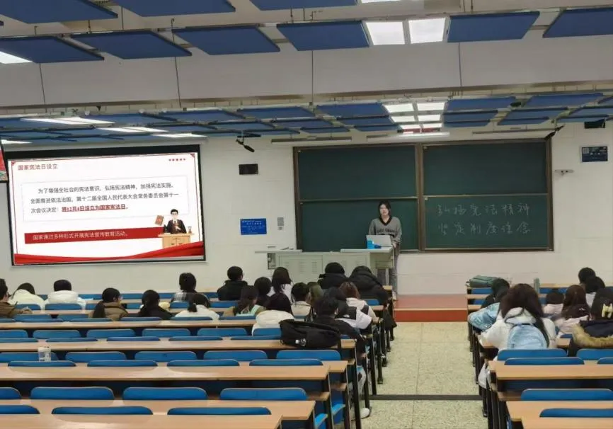 活动伊始,程诗涵向同学们详细讲解了宪法的历史、核心内容以及在国家治理中的重要地位,并结合实际案例,阐述了宪法如何保障公民权利、规范国家权力运行,使同学们深刻认识到宪法是国家的根本大法,在维护社会公平正义、保障公民基本权利、推动国家稳健前行等诸多层面,有着无可替代的关键作用。
