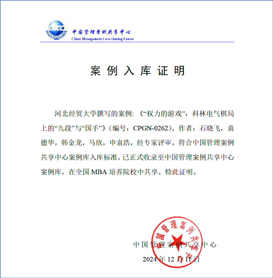 近日,MBA教育中心教授石晓飞带领四名学生撰写的教学案例《“权力的游戏”:科林电气棋局上的“九段”与“国手”》(编号:CPGN-0262)入选中国管理案例共享中心案例库。