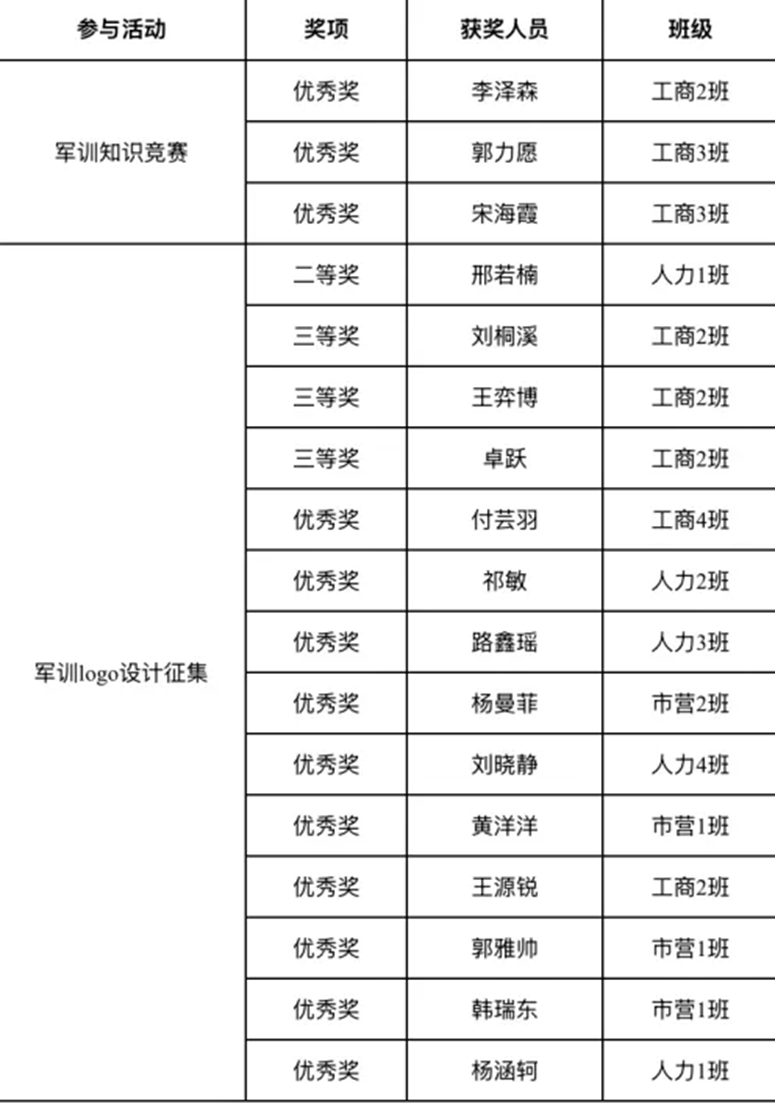 在第四届国防知识大赛暨首届军训知识竞赛中,必赢官网李泽森、郭力愿、宋海霞同学凭借过硬的理论知识和良好的军事素养获得了优秀奖。在军训LOGO征集活动中,必赢官网凭着优秀的组织领导、积极向上的文化氛围与共同价值观、优异的成绩获得优秀组织奖;邢若楠同学获得二等奖;刘桐溪、王弈博、卓跃同学获得三等奖;付芸羽、祁敏、路鑫瑶等同学获得优秀奖;贾晶晶、张芷璐老师获优秀指导教师奖。